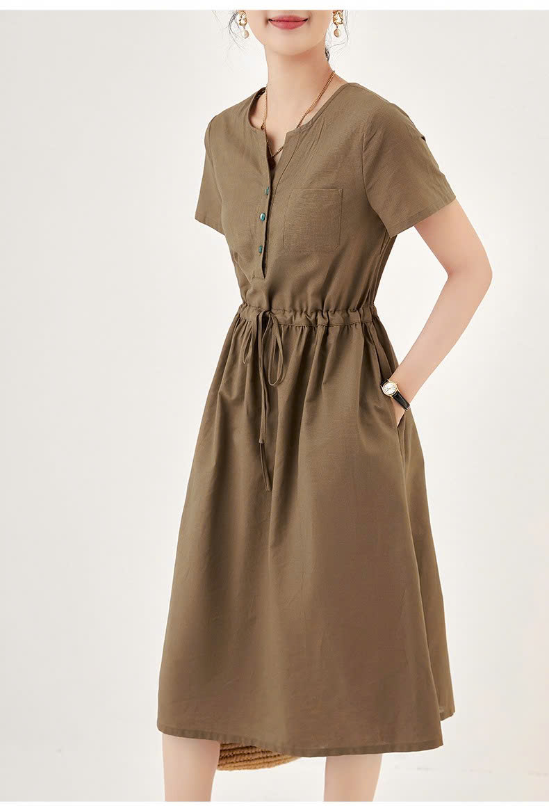 ✨Đầm cao cấp Đũi Việt thiết kệ cổ V và dây rút sang trọng, trẻ trung da218