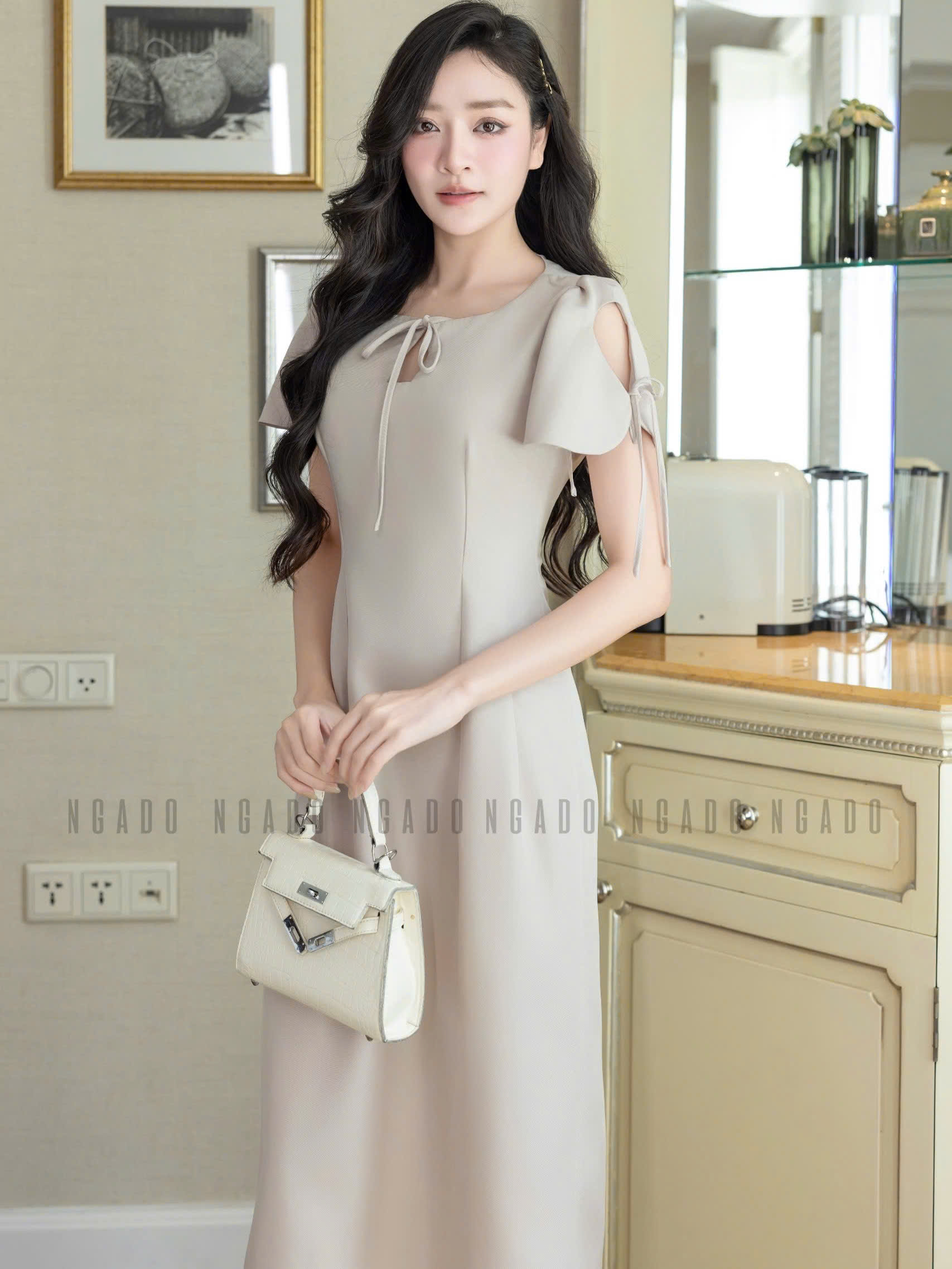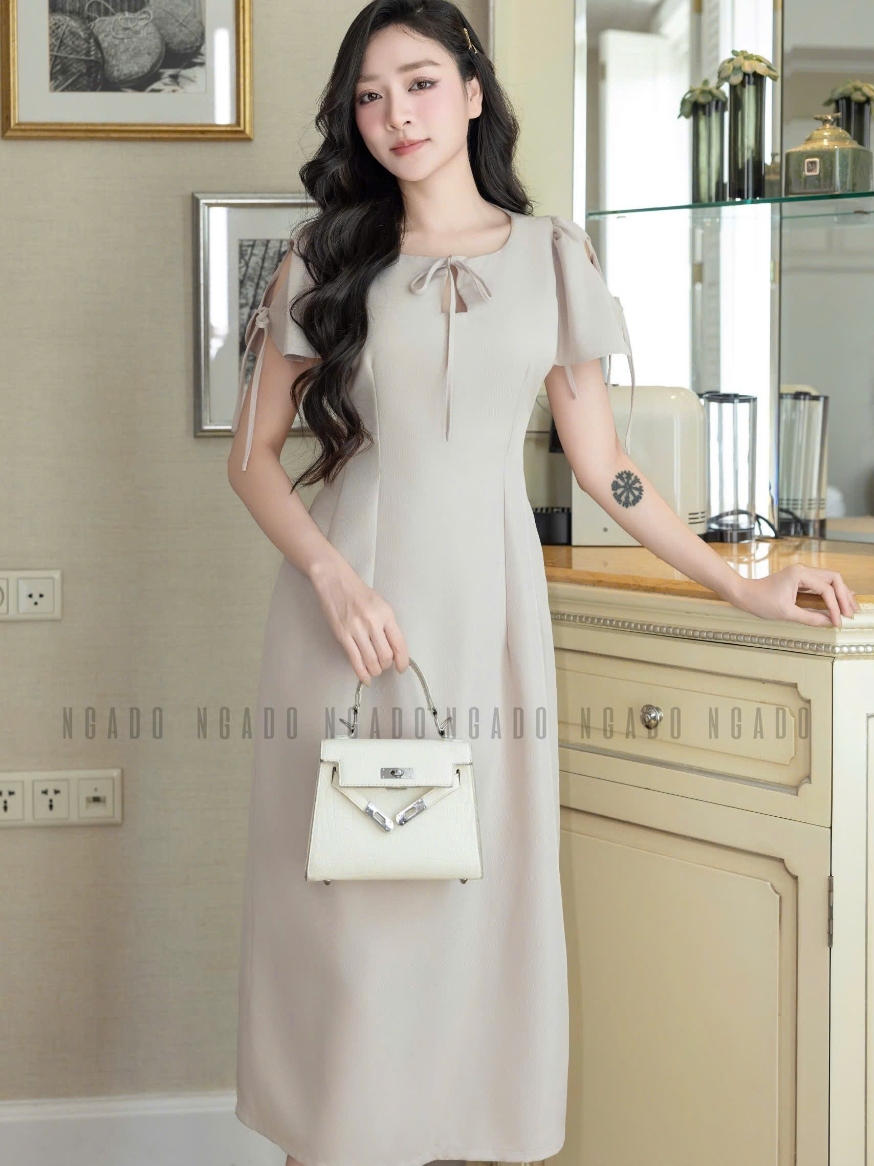✨Đầm nude kem cổ giọt nước NGADO , đầm dài , đâm dự tiệc , công sở