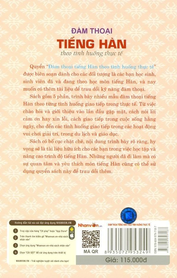 Quyển “Đàm thoại tiếng Hàn theo tình huống thực tế” được biên soạn dành cho các đối tượng là các bạn học sinh, sinh viên đã và đang theo học môn tiếng Hàn, và nay muốn có thêm tài liệu để trau dồi kỹ năng đàm thoại.