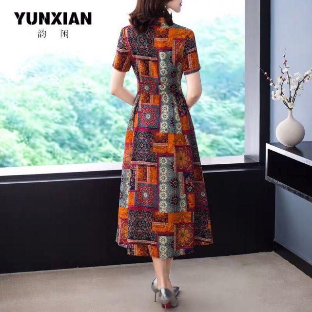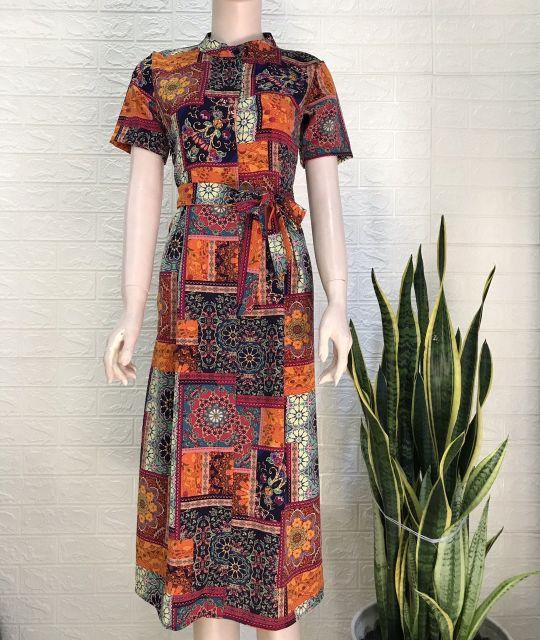 ĐẦM XOÈ HOẠ TIẾT HOA CỔ TRỤ Chất: lụa mango Màu: hoạ tiết như hình Kiểu dáng: đầm xoè cổ trụ, tay ngắn, cài nút trước ẩn, kèm dây thắt eo rời, dây kéo bên hong Size: M L XL