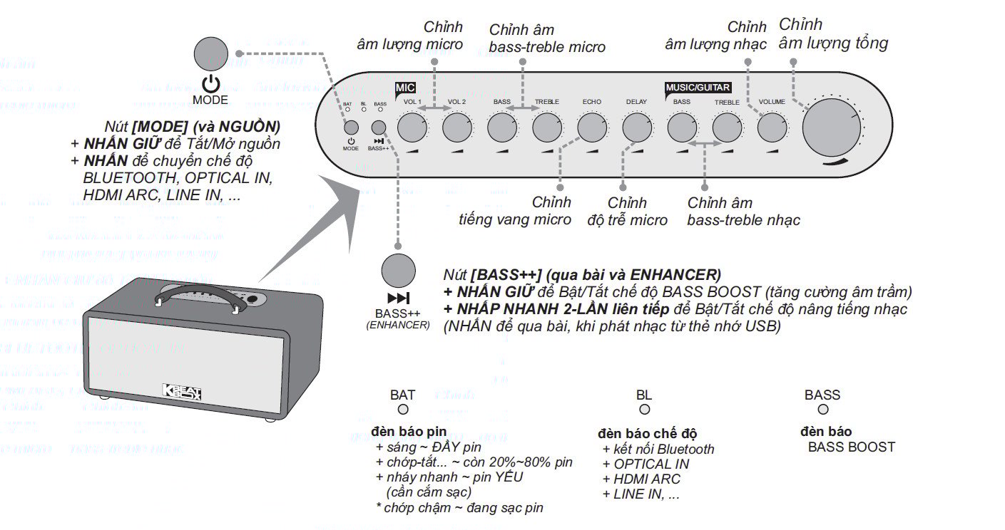 Cổng LINE IN: dùng để kết nối với các thiết bị phát nhạc như điện thoại, máy tính bảng, máy nghe nhạc... qua jack 3.5mm và chọn nguồn nhạc từ cổng này bằng cách nhấn nút MODE