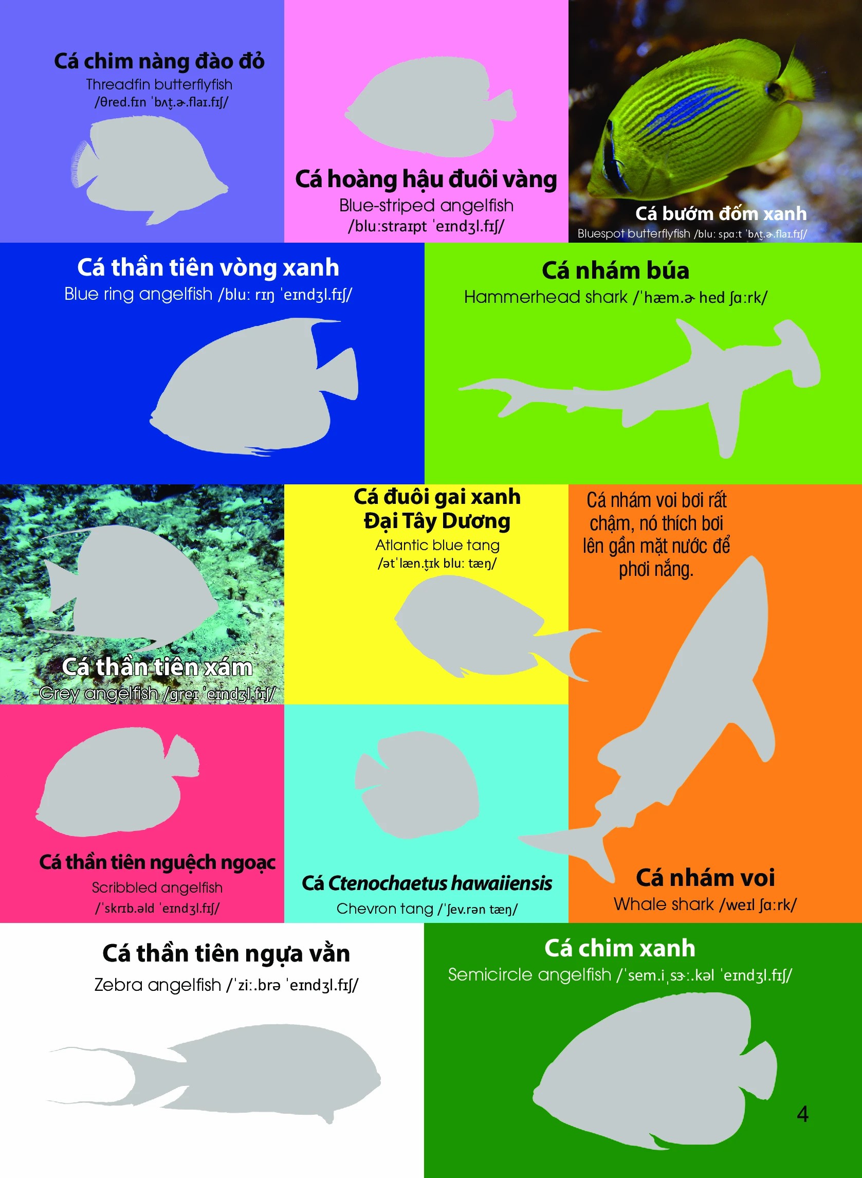 Song ngữ Việt - Anh: Cuốn sách được thiết kế song ngữ Việt - Anh, giúp bé làm quen với từ vựng tiếng Anh về các loài động vật biển một cách tự nhiên và hiệu quả.