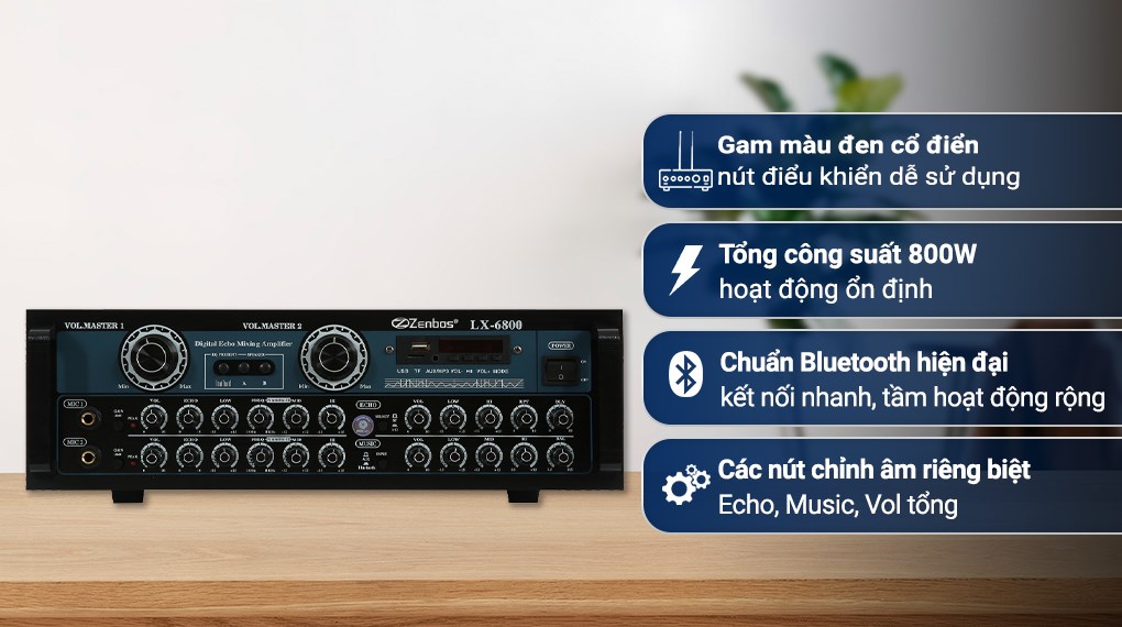 *Amply Zenbos LX-6800 800W- Số lượng kênh: 2 kênh- Tổng công suất: 800W- Nguồn: 220V- Phím điều khiển: Nút bấm và nút vặn cơ học- Kết nối không dây: Bluetooth- Cổng phát nhạc: AV- Thẻ nhớ TF, Jack 3.5 mm, USB- Khoảng cách kết nối tối đa: 10m- Điều khiển bằng điện thoại: Có- Kích thước: 42x25x14 cm - Nặng: 6.5 kg- Sản xuất tại: Việt Nam- Hãng: Zenbos
