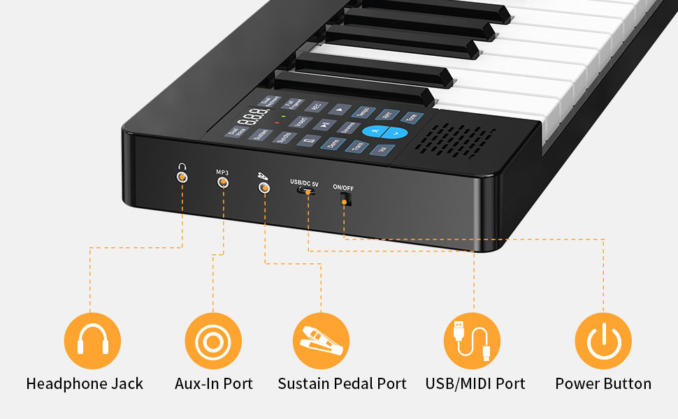 - Đàn có cổng USB và cáp đi kèm, hỗ trợ mạnh mẽ kết nối với các thiết bị khác như: Máy tính, Máy tính bảng, S Để làm nhạc, chơi nhạc điện tử EDM, thu âm, phát ra loa lớn
