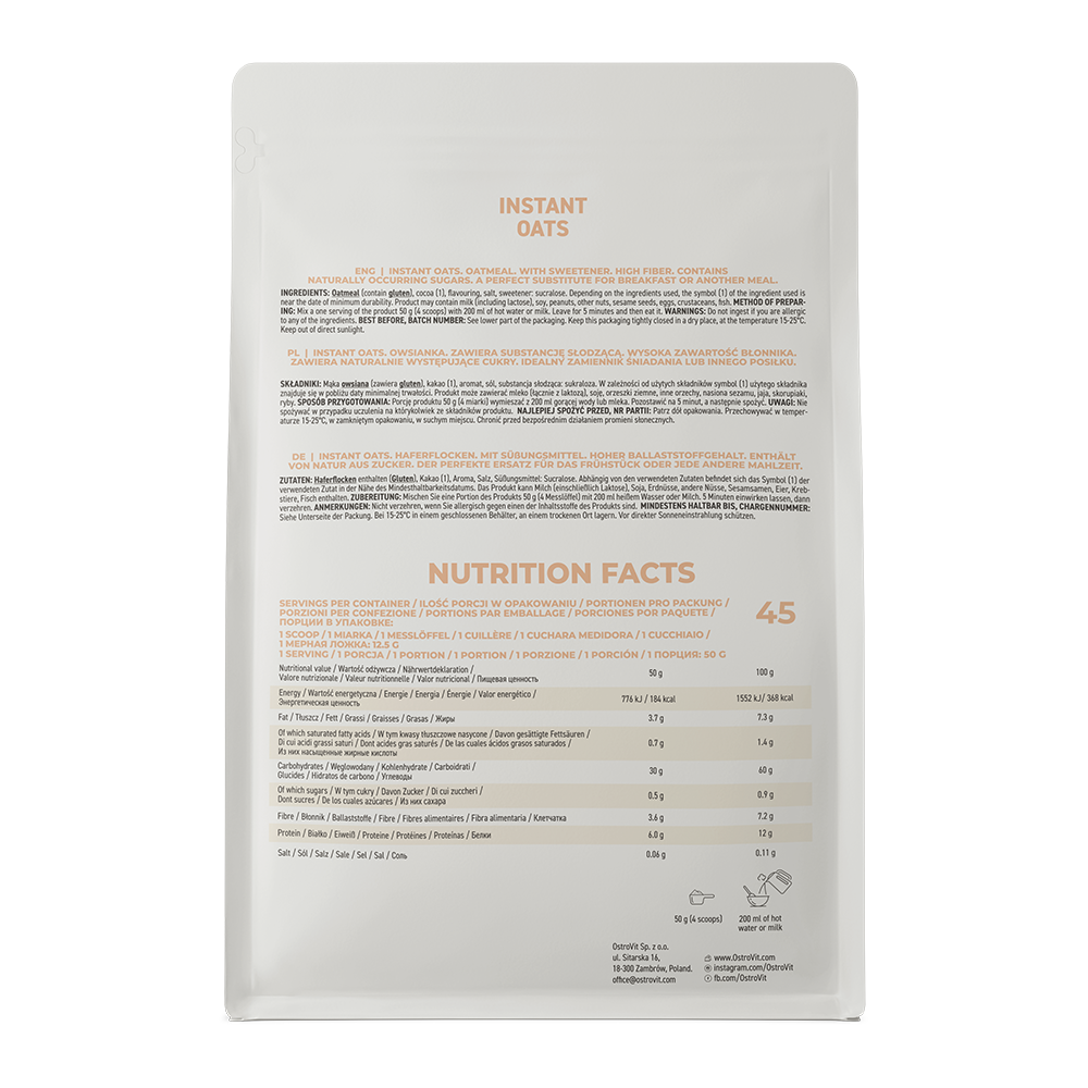 Giới thiệu về OstroVit Instant Oat Flakes 2270 g OstroVit Instant Oat Flakes là dòng bánh ngũ cốc dinh dưỡng, có sẵn trong hai hương vị thơm ngon: sô cô la và dâu, bạn có thể chuẩn bị trong vòng chỉ năm phút. Sản phẩm, nhờ vào thành phần của ngũ cốc, giàu chất xơ, beta-glucan và vitamin B1, nhờ đó sẽ mang lại cho bạn không chỉ một bữa ăn ngon mà còn rất có giá trị dinh dưỡng. Bạn đang tìm kiếm ý tưởng cho một bữa sáng dễ chuẩn bị mà sẽ no lâu và cung cấp năng lượng cho cả ngày? Hãy chọn OstroVit Instant Oat Flakes!
