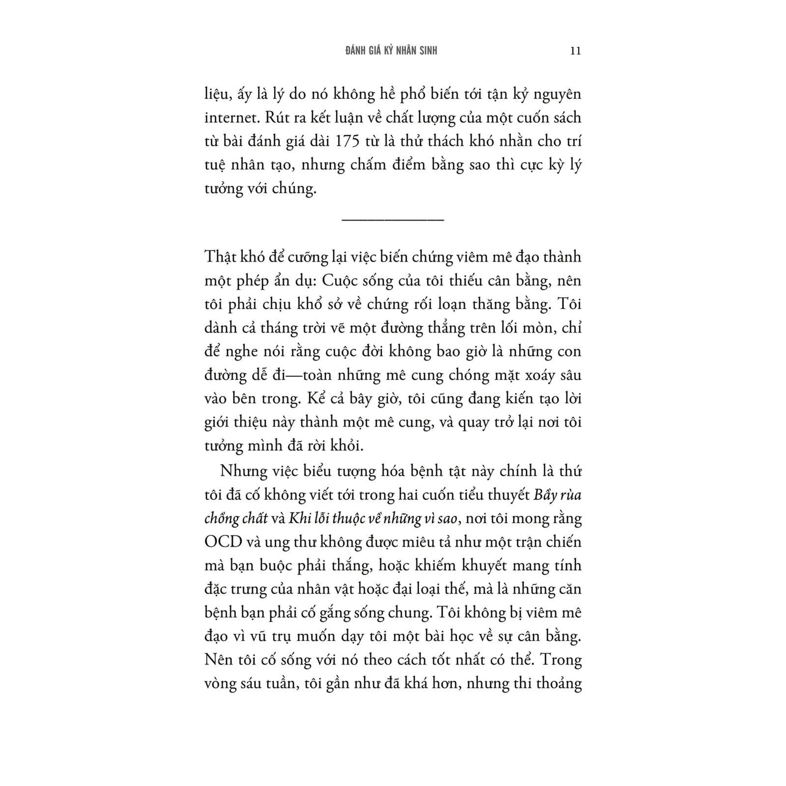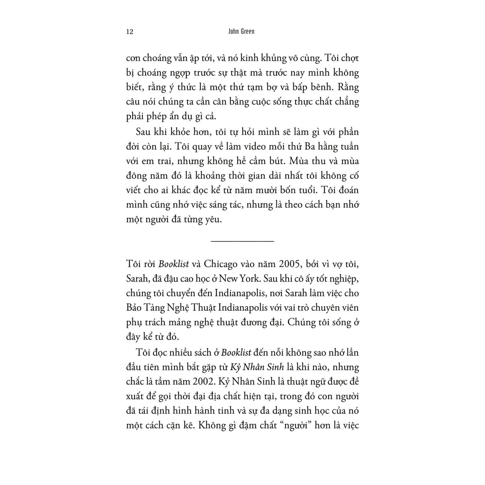 Các bài viết trong "Đánh giá kỷ nhân sinh" một lần nữa cho thấy tài kể chuyện hiếm có của John Green. Tác phẩm là cuộc hành trình khám phá đầy cảm hứng về những con đường mà chúng ta đã khai mở, đồng thời là một lời tụng ca chân thành về tình yêu dành cho thế giới.