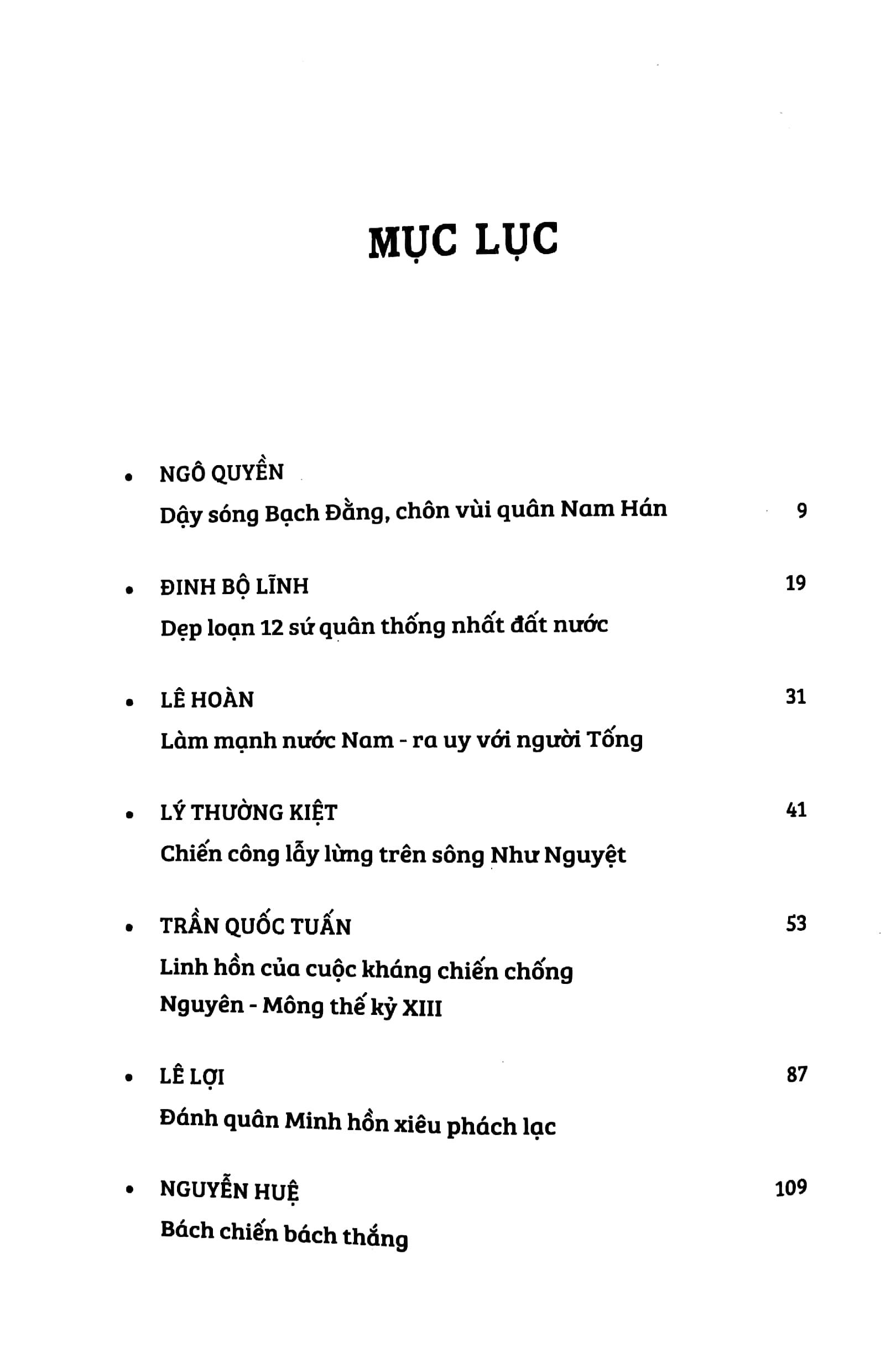 Mua tại TiktokSách viết về 17 danh nhân quan sự Việt Nam: 1. Ngô Quyền, 2. Đinh Bộ Lĩnh, 3. Lê Hoàn, 4. Lý Thường Kiệt 5. Trần Quốc Tuấn,,6. Lê Lợi,, 7. Nguyễn Huệ, 8. Trương Định 9. Võ Duy Dương,10. Nguyễn Trung Trưc, 11. Hoàng Hoa Thám, 12. Tôn Thất Thuyết, 13. Phan Đình Phùng,14. Nguyễn Duy Hiệu,15. Đinh Công Tráng, 16. Nguyễn Thiện Thuật và 17. Võ Nguyên Giáp. Đây là tập sách hay, có giá trị lịch sử và văn học, qua nghệ thuật viết theo lối kể chuyện với việc tổng hợp các dữ liệu công phu, hấp dẫn .