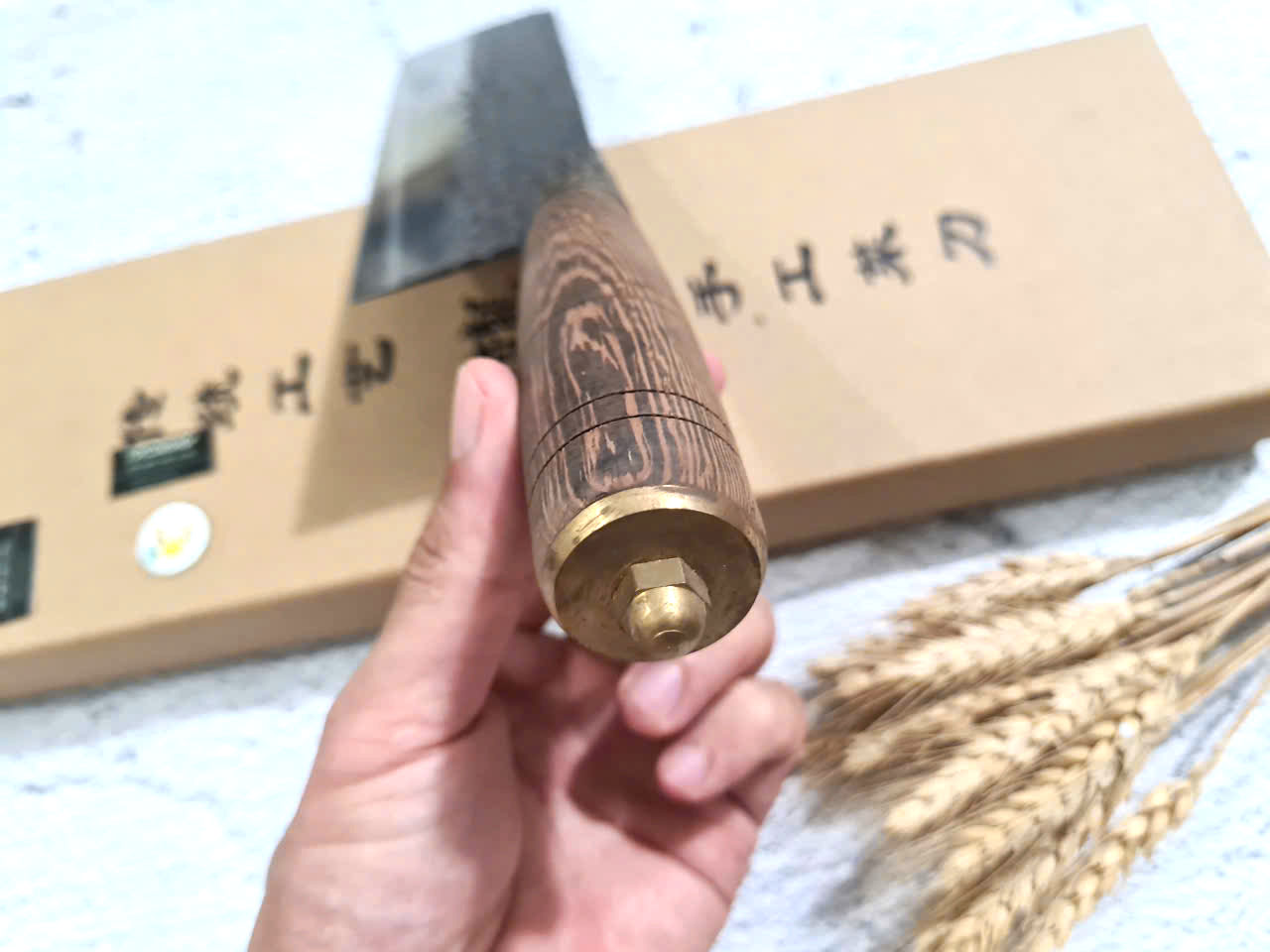 Chất liệu tay cầm: gỗ CẨM LAI, khâu và chuôi cuối dao bằng đồng thau