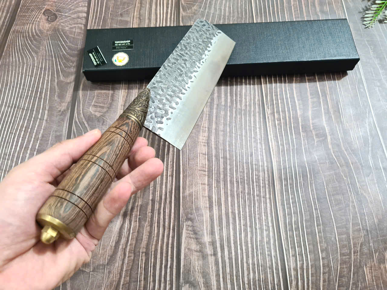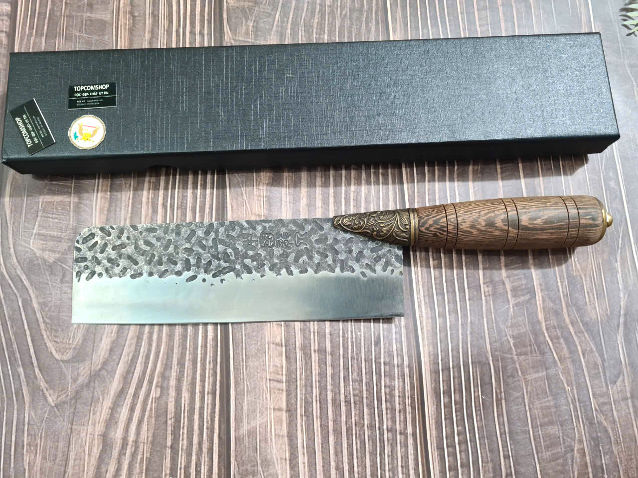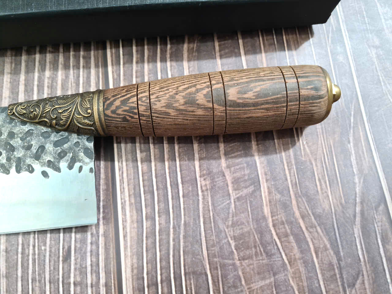 Chất liệu tay cầm: gỗ CẨM LAI, khâu và chuôi cuối dao bằng đồng thau