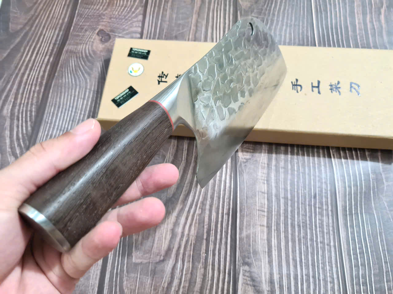 - Chức năng: Chặt xương ống, chân giò, trâu bò - Kích thước: Lưỡi: 22cm, cán: 10cm, rộng: 10cm, dầy: 5ly, trọng lượng: 800g - Cán : Gỗ mun, Khâu đồng đỏ , chốt đinh