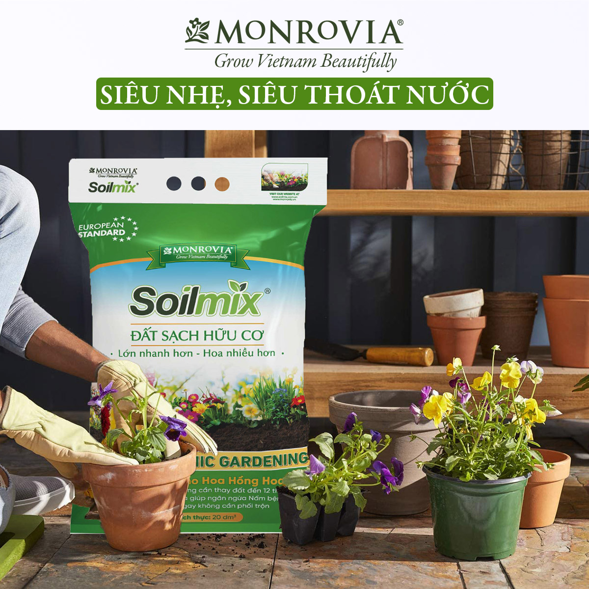 Đất trồng cây hữu cơ Soilmix, giá thể sạch trồng sen đá, hoa hồng, cây cảnh, chứa phân bón vi sinh, trichoderma, perlite Thông tin sản phẩm: Đất trồng cây Soilmix là hỗn hợp đất trồng cây được phối trộn sẵn có nguồn gốc hữu cơ tự nhiên, chuyên dụng cho hoa hồng, sen đá, các loại cây cảnh hay hoa kiểng. Sản phẩm được bổ sung các thành phần giàu dinh dưỡng như: Phân bón vi sinh Đá perlite Trấu hun nguyên vỏ Xơ dừa đã xử lí Trichoderma, vi sinh hỗ trợ bộ rễ Khoáng, vi lượng Với công thức độc quyền từ Monrovia, đất trồng cây Soilmix sử dụng hoàn toàn nguyên liệu hữu cơ sạch, loại nhập khẩu cho chất lượng vượt trội. Phân bón vi sinh giàu đạm, lân, kali, amino acid giúp cân bằng dinh dưỡng trong quá trình sinh trưởng và phát triển của cây. Trichoderma được bổ sung giúp bộ rễ phát triển tối ưu, hỗ trợ phục hồi rất tốt đối với những cây bệnh, yếu. Đá perlite xốp, nhẹ được bổ sung để tăng khả năng giữ nước, chất dinh dưỡng đồng thời điều hòa nhiệt độ và độ ẩm cho đất trồng, giúp cho đất tơi xốp thoáng khí, từ đó hỗ trợ bộ rễ phát triển mạnh mẽ. Ưu điểm vượt trội của đất trồng cây Soilmix đó là: