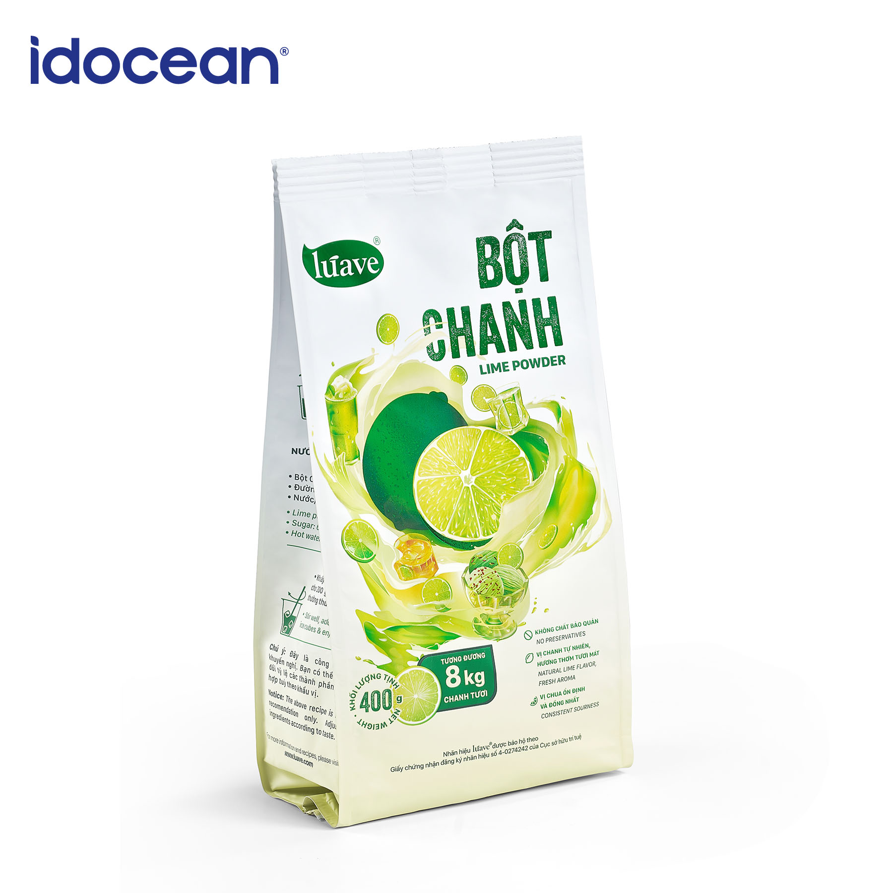 Không sử dụng chất bảo quản Đặc biệt 1 túi bột chanh Lúave 400g tương đương với 8kg chanh tươi. Vì thế, khi sử dụng bột chanh sẽ giúp chủ quán tối ưu được nhiều chi phí trong vận hành. Ứng dụng của bột chanh Bột chanh Lúave ứng dụng được nhiều trong pha chế. Bột chanh Lúave có thể thay thế hoàn toàn chanh tươi mà vẫn giữ được độ chua ổn định, vị chanh tự nhiên. Bên cạnh đó, bột chanh Lúave còn áp dụng trong nấu nướng như các món lẩu, làm gỏi, nước chấm, Thành phần của bột chanh Thương hiệu Lúave Sản xuất Công ty TNHH Đại Dương Ý Tưởng Thành phần Đường dextrose, chất điều chỉnh độ acid, bột hương liệu chanh tự nhiên, bột chanh (2%), Quy cách đóng gói 400g/ túi, 12 gói/ thùng