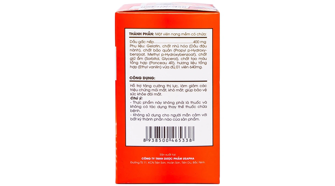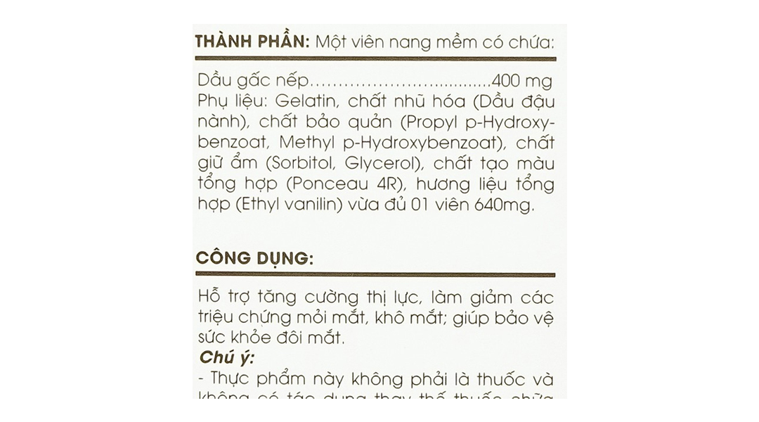 Thành phần  Một viên nang mềm có chứa: Dầu gấc nếp: 400mg Công dụng  Hỗ trợ tăng cường thị lực, làm giảm các triệu chứng mỏi mắt, khô mắt, giúp bảo vệ sức khỏe đôi