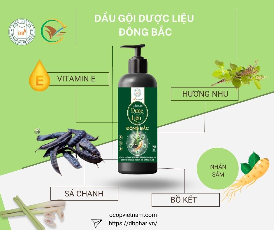 Sản phẩm được chiết xuất 100% từ một số loài thảo mộc tự nhiên như Bồ kết, Cỏ mần trầu, cỏ mực, sả Đây là những thảo mộc được trồng trực tiếp tại Công ty và được thu mua từ các Hội viện Hội Nông dân xã Cộng Hoà, thành phố Cẩm Phả, tỉnh Quảng Ninh, và được kiểm soát chất lượng nguyên liệu trước khi đưa vào sản xuất theo tiêu chuẩn cơ sở. Sản phẩm ngoài tác dụng giúp làm sạch da đầu còn có tác dụng nuôi dưỡng tóc, da đầu giúp tóc chắc khoẻ, suôn mềm, giảm gẫy rụng và kích thích mọc tóc, giúp bảo vệ da đầu khỏi gàu và nấm ngứa.