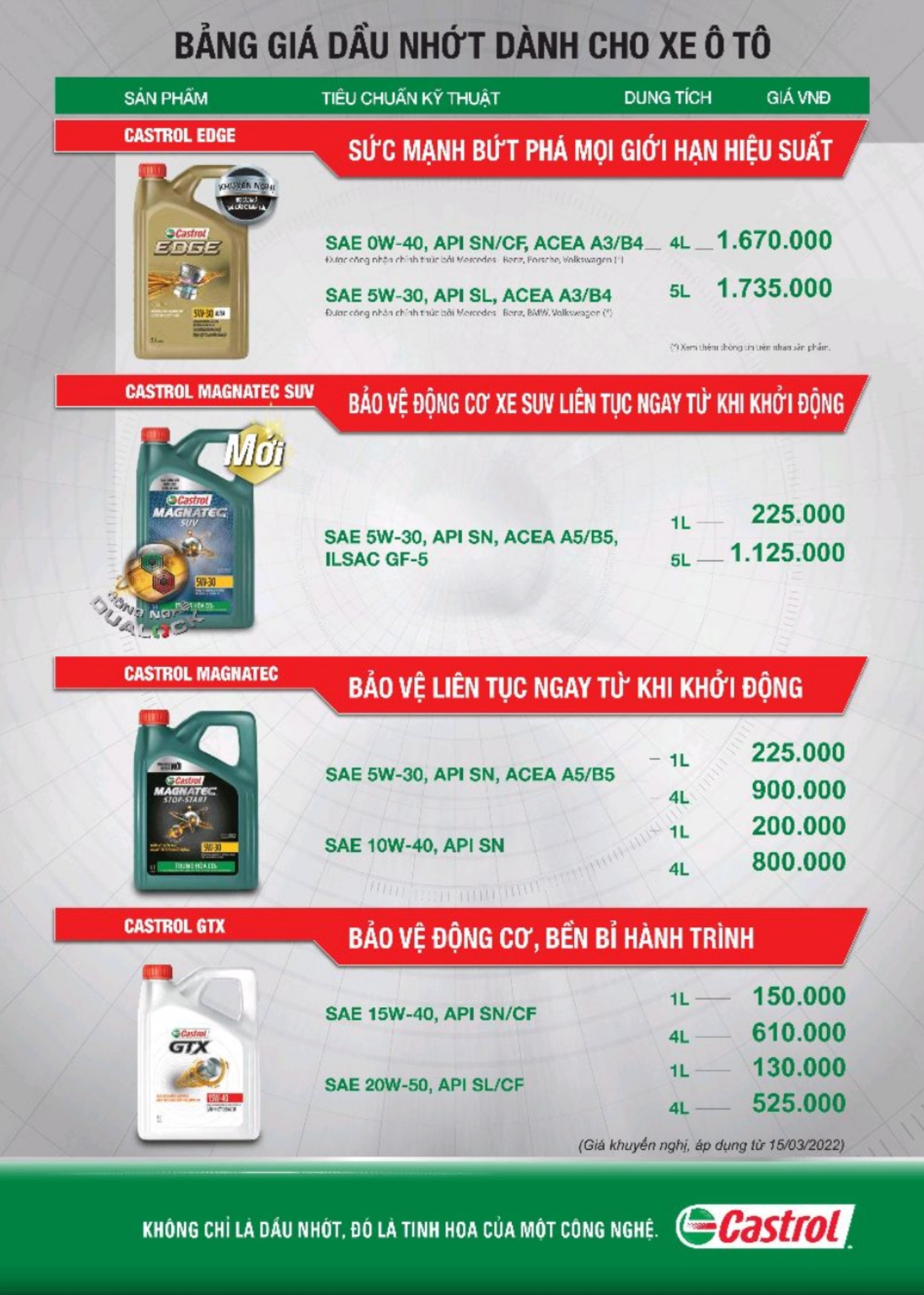 Các mẫu dầu nhớt Castrol mới nhất hiện tại dành cho ô tô
