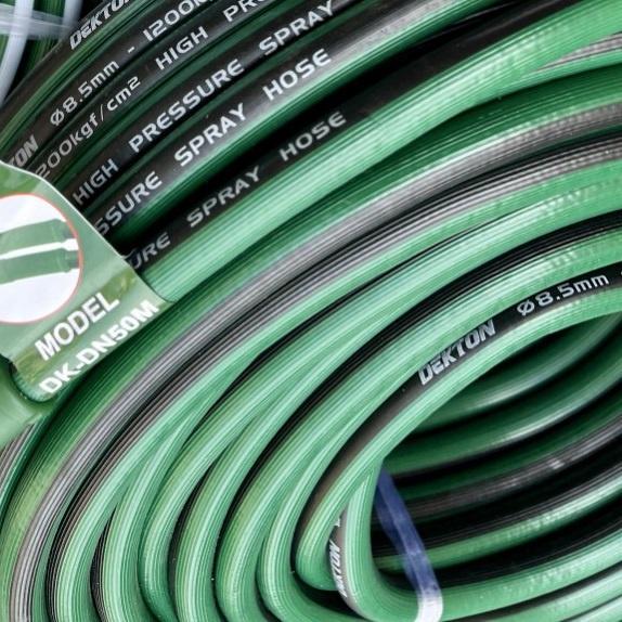Dây xịt rửa cao áp Dekton được làm từ lớp chịu lực được đan bằng sợi cotton không khe hở, giúp chịu được áp lực cao mà không gây ra các vết nứt hay hỏng hóc. Chất liệu này không chỉ giúp dây có độ bền cao mà còn đảm bảo tính linh hoạt, dễ dàng sử dụng trong nhiều điều kiện khác nhau.