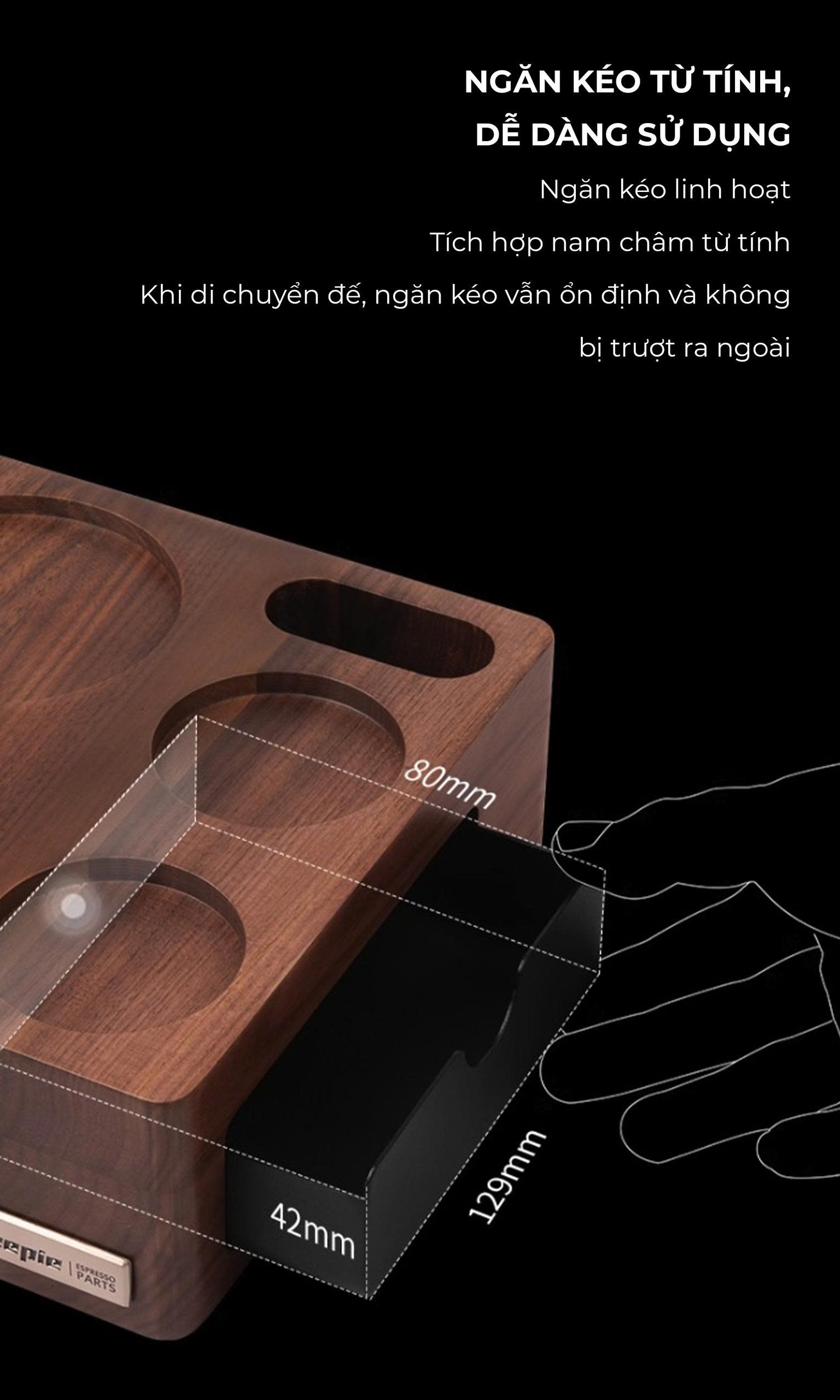 GIÁ ĐỠ TAMPER BẰNG GỖ TỰ NHIÊN PHA CÀ PHÊ MÁY ESPRESSO CAFE DE KONA Khối gỗ được làm bằng 2 loại gỗ: gỗ óc chó đen và gỗ giẻ gai châu âu.