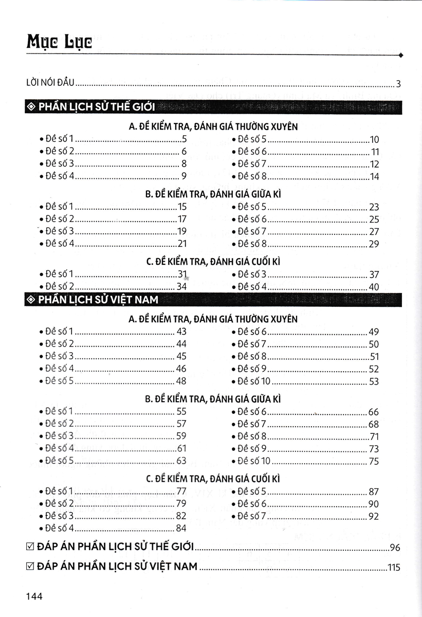 Cuốn sách được biên soạn dưới dạng hệ thống các đề kiểm tra, đánh giá thường xuyên, đánh giá giữa kì và đánh giá cuối kì với những câu hỏi tự luận và trắc nghiệm lịch sử thế giới và lịch sử Việt Nam sát hợp với nội dung, chương trình đổi mới, theo các mức độ nhận biết, thông hiểu và vận dụng kiến thức, phù hợp với tất cả các đối tượng học sinh.