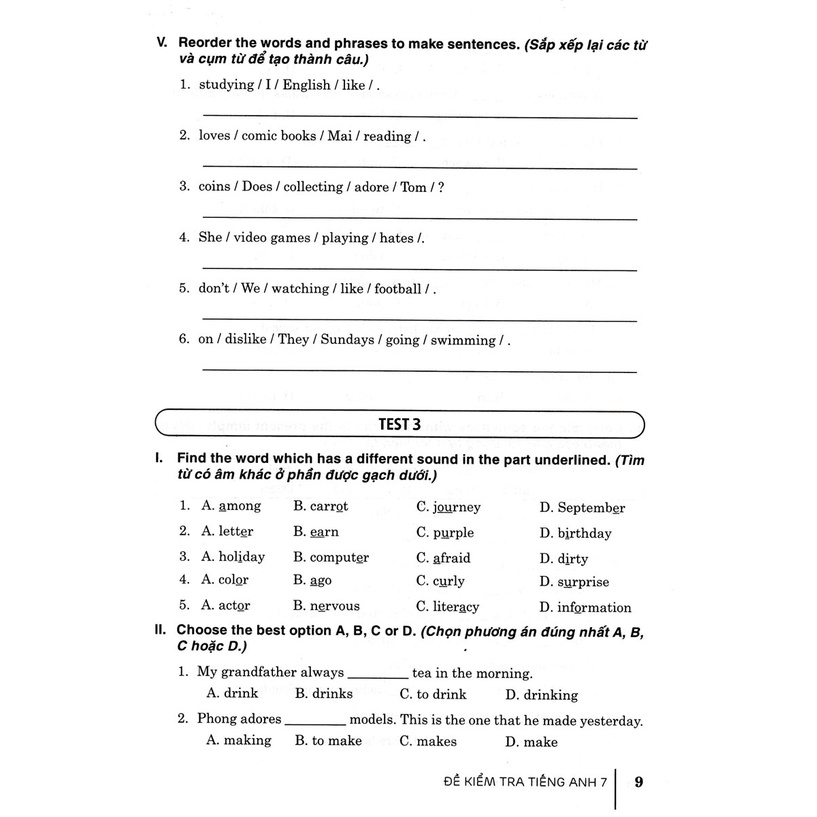 Sách bao gồm nhiều để kiểm tra với rất nhiều dạng khác nhau để các em luyện tập cách giải đề. Nội dung các đề kiểm tra bám sát các phần Ngữ âm, Từ vựng và Ngữ pháp, cũng như các chủ đề của mỗi bài học trong sách giáo khoa Tiếng Anh 7, hơn nữa còn được mở rộng thêm nên sẽ rất dễ dàng để các em vừa kiểm tra lại kiến thức đã học ở trường, vừa luyện tập và phát triển các kĩ năng phát âm, đọc, nói và viết.