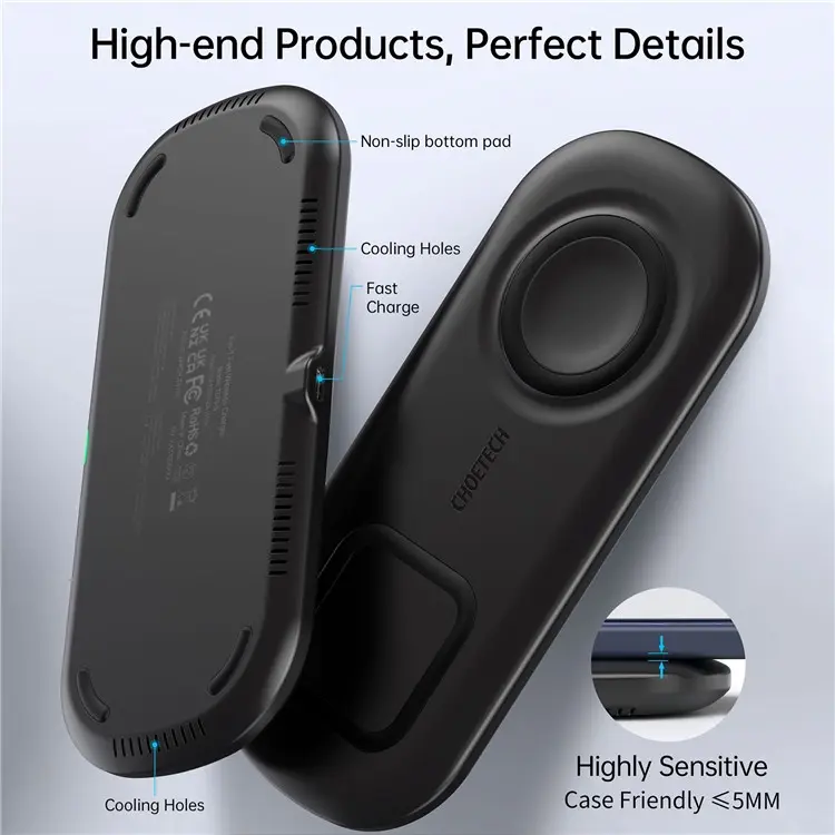 Đế sạc nhanh không dây 15W 2 in 1 hiệu CHOETECH T570-S Cuộn cảm được thiết kế tách biệt với bộ xử lý bởi đĩa cách từ cho hiệu suất sử dụng cao hơn, an toàn hơn. Bảo vệ an toàn tuyệt đối cho thiết bị và người sử dụng. Khả năng tự động ngắt điện khi sạc đầy, giúp bảo vệ pin điện thoại, tăng tuổi thọ pin. Đạt chuẩn Qi cho sạc không dây.