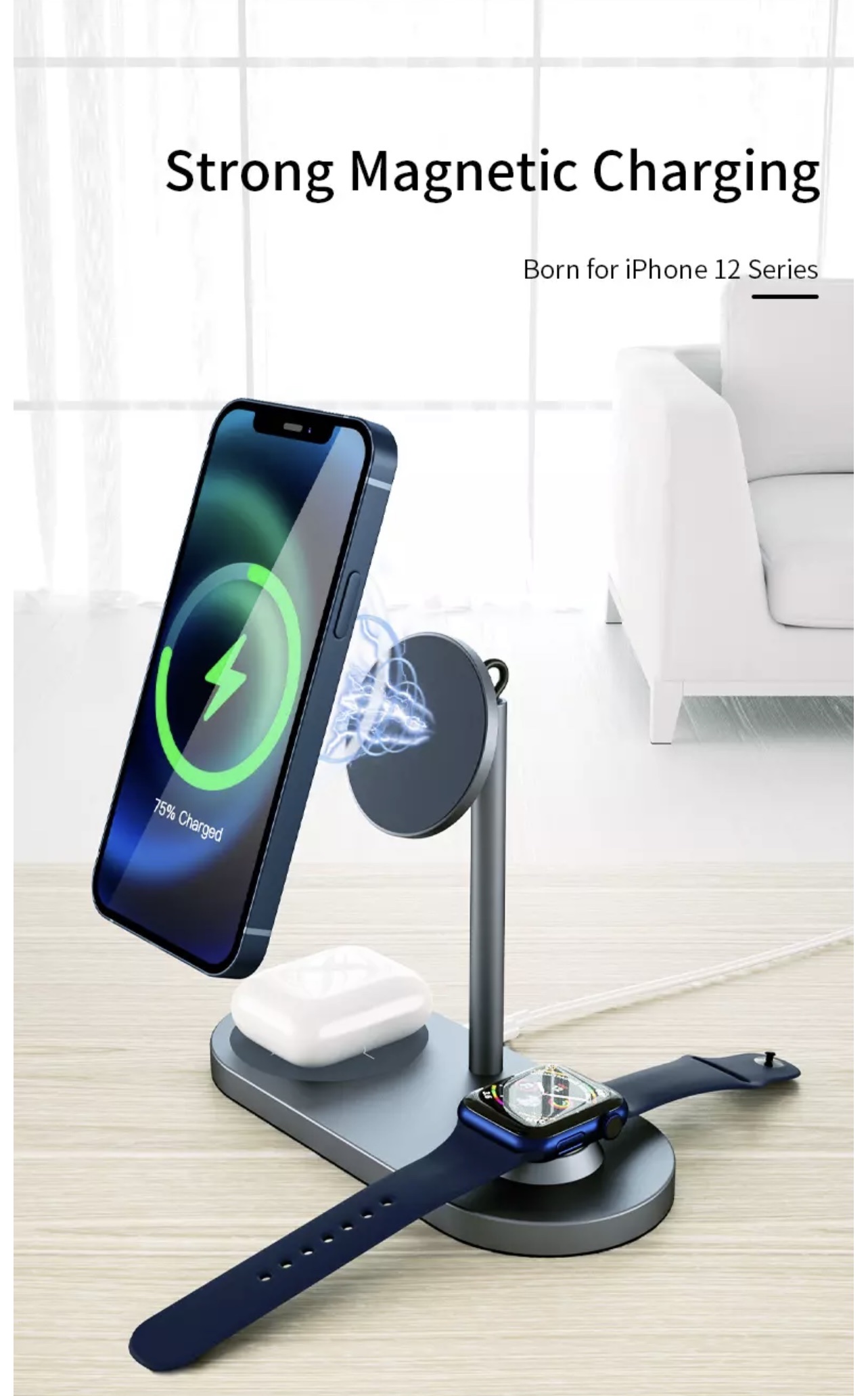 Lực hút nam châm tăng 20% so với các sản phẩm thông thường, giữ chặt thiết bị tương thích ngay cả khi di chuyển. Bạn có thể sạc ba thiết bị cùng lúc với một