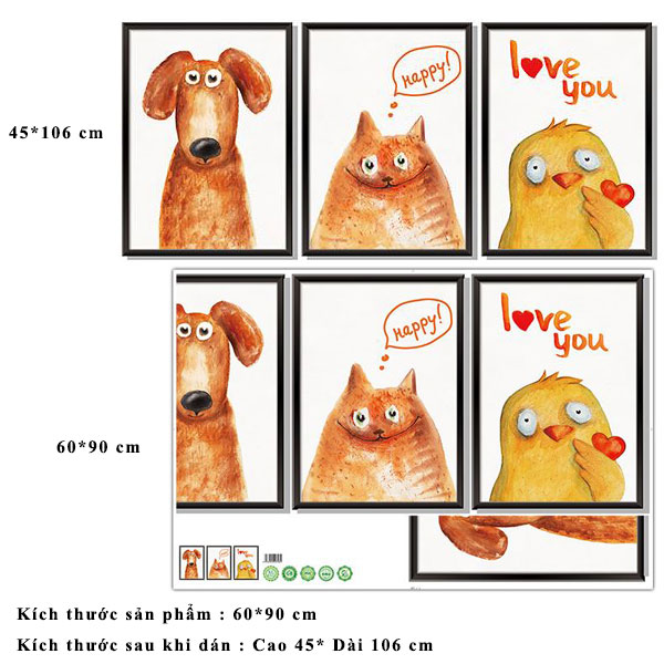 Kích thước :Decal dán tường khung tranh Chó mèo gà XL8322