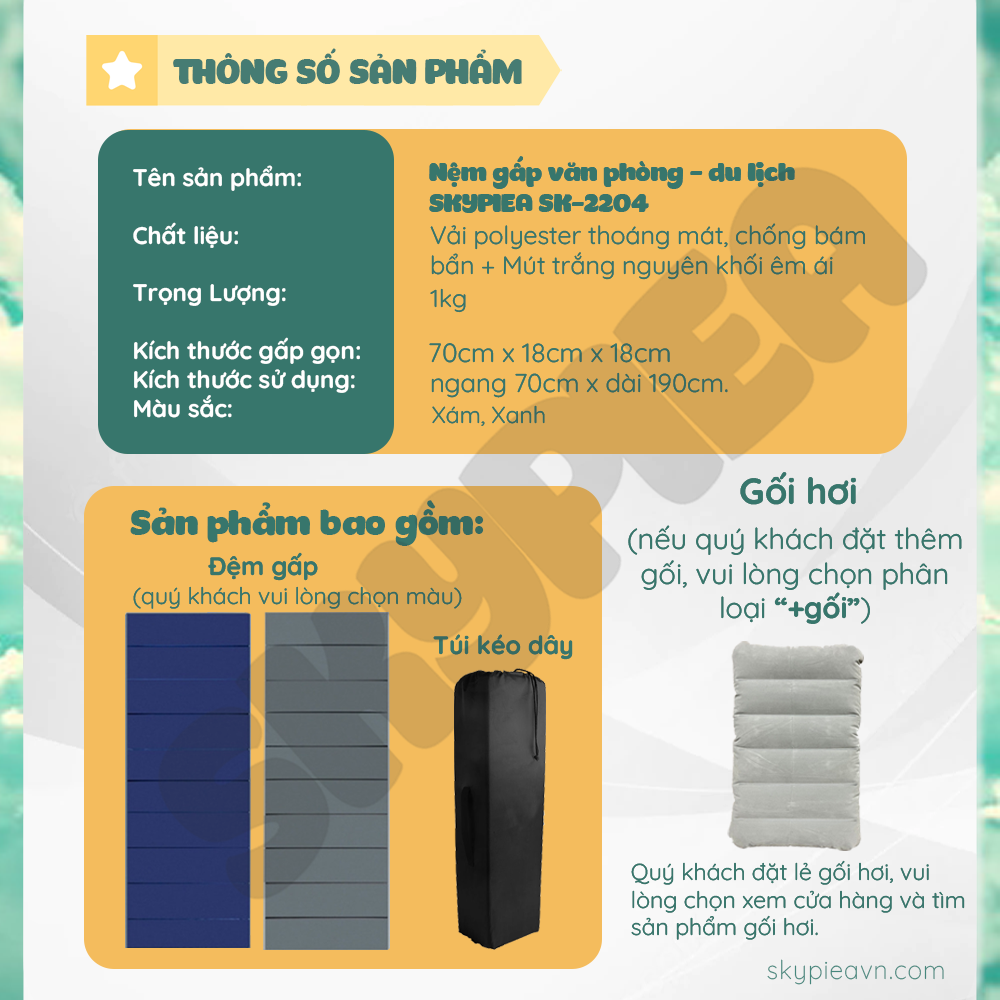Đệm Gấp Du Lịch Văn Phòng - Tặng Kèm Gối Hơi - Chất Liệu Bông Ngọc Trai Dài 190x70 Cm
