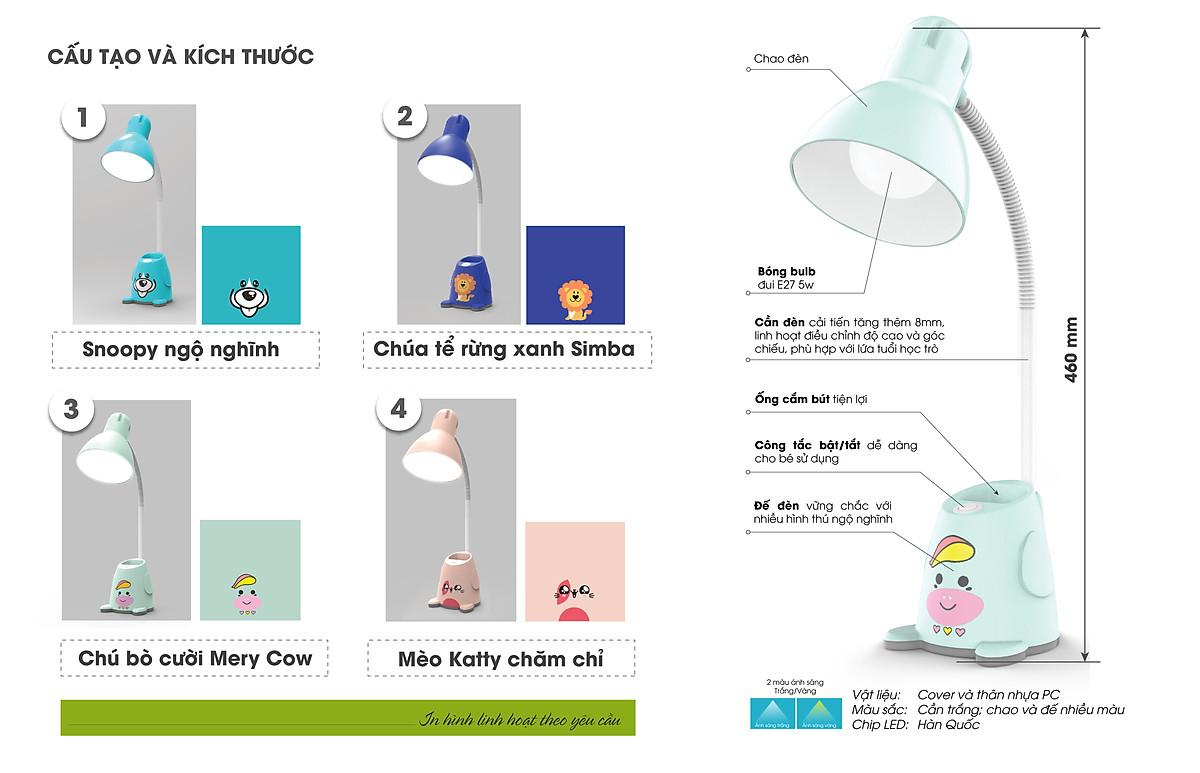 1/ ĐIỂM ĐẶC BIỆT SẢN PHẨM: - Sản phẩm sử dụng cho chiếu sáng, học tập - Dùng loại đui đèn xoắn E27 thông dụng trên thị trường nên dễ dàng thay thế - Khớp