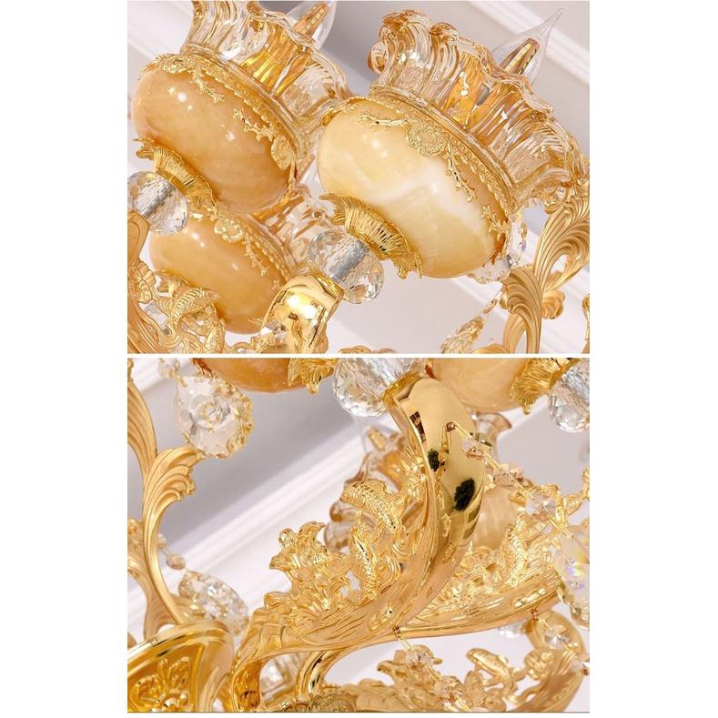 Khung đèn: Khung hợp kim sơn tĩnh điện bền, đẹp. Khung đèn được khéo léo mạ một lớp vàng 18k bên ngoài kết hợp với đá tự nhiên giúp làm tăng độ sang trọng của toàn thể chiếc đèn chùm.