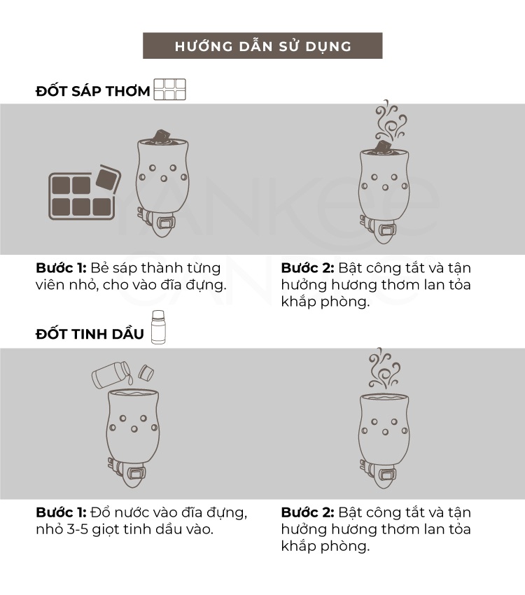 Đèn khuếch tán hương thơm sử dụng bóng đèn Edison để làm sáp ấm lên và tan chảy trong đĩa, từ đó lan tỏa hương thơm trong không khí. HƯỚNG DẪN SỬ DỤNG