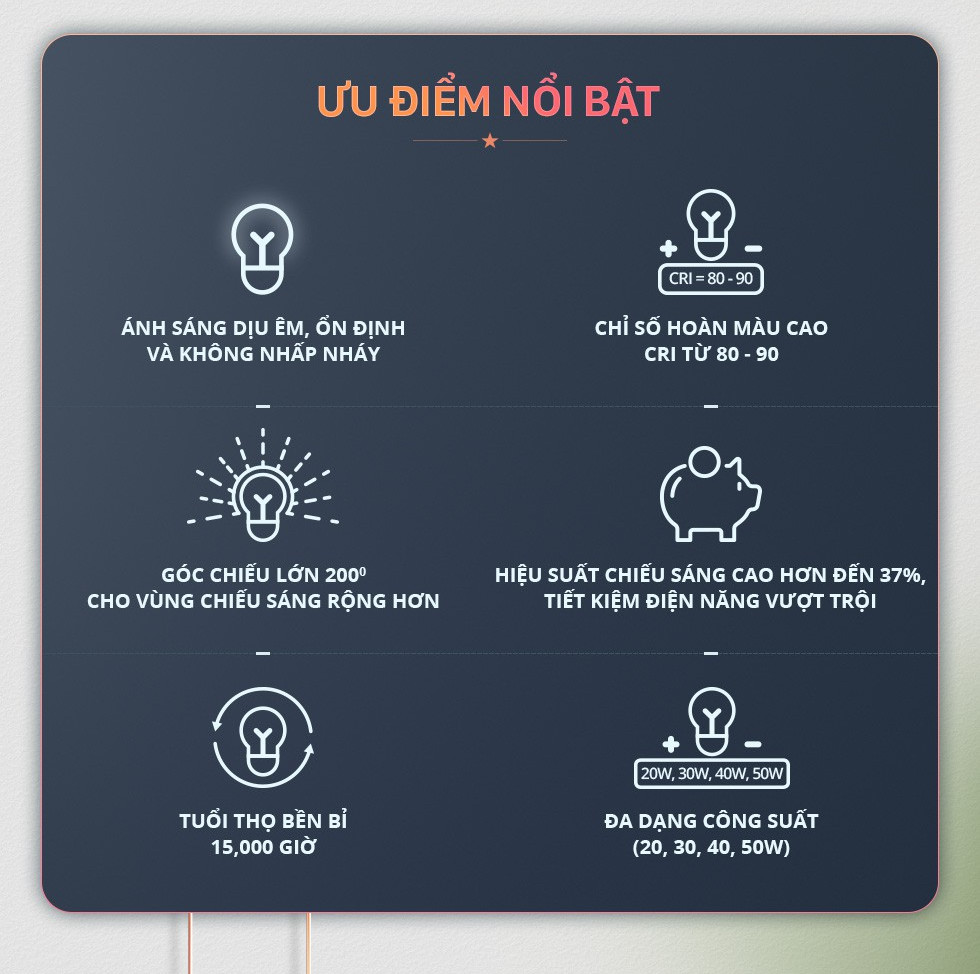 • Ánh sáng ổn định, không nhấp nháy giúp bảo vệ đôi mắt bạn một cách tốt nhất.