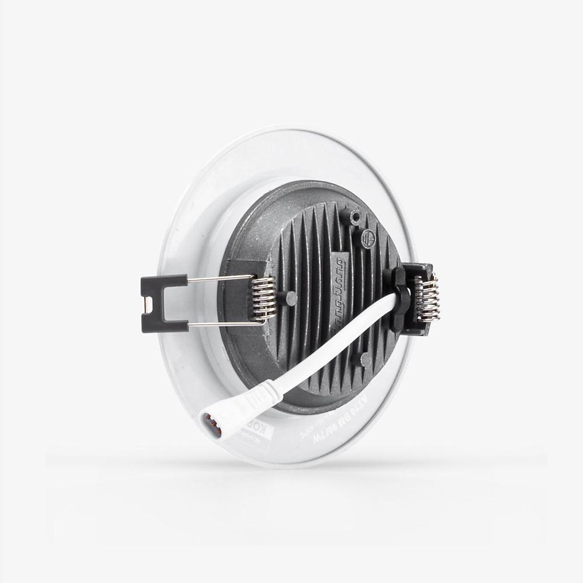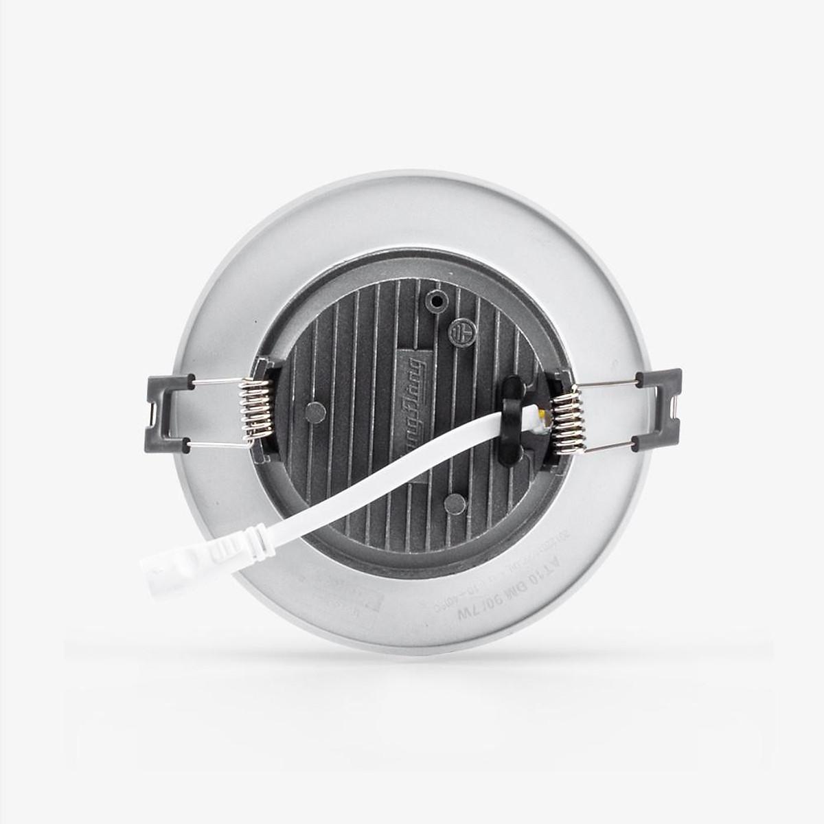 Đèn LED âm trần downlight đổi màu 7W viền bạc Model: AT10 ĐM 90/7W Công suất: 7W Điện áp: 220V/50Hz Quang thông: 700lm Nhiệt độ màu: 6500K/3000K/4000K Kích thước (ØxH): (118x33)mm ĐK lỗ khoét trần: