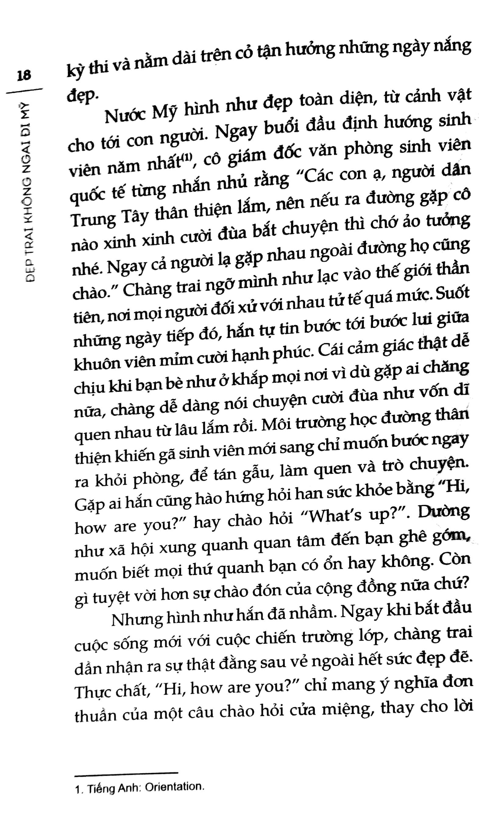 Đi Mỹ thôi đã là mơ ước của nhiều người rồi. Du học Mỹ thì hẳn là oách khỏi nói.Nhưng, rất đột ngột khôn lường và không khỏi làm bạn chán chường, bạn khó mà tưởng được sẽ gặp một thằng bạn Mỹ cùng phòng thích xịt nước hoa nhưng cả tuần không tắm, một thằng bạn cao thủ giải toán cao cấp bằng... google, những buổi tiệc tùng tới bến với chất có cồn trong ký túc xá, hay vài chuyện yêu đương nhảm nhí trai gái này nọ này nọ của đám sinh viên Mỹ. Nhưng, lại nhưng, bạn đồng thời thấy mình trưởng thành hơn sau quãng thời gian sống tự lập nơi xứ người, thấy mình đứng đắn hơn sau những năm học tập, nghiên cứu chỉn chu, thấy mình “giàu có” hơn sau những hành trình khám phá dọc ngang nước Mỹ rộng lớn, và thấy mình sẵn sàng thực hiện những ước mơ to táthơn trong tương lai.