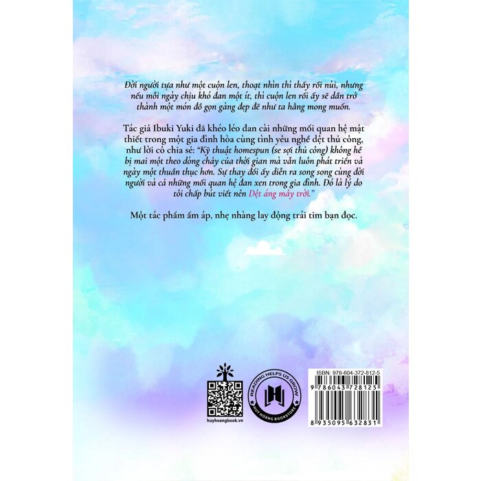 Tác giả Ibuki Yuki đã khéo léo đan cài những mối quan hệ mật thiết trong một gia đình hòa cùng tình yêu nghề dệt thủ công, như lời cô chia sẻ: “Kỹ thuật homespun (se sợi thủ công) không hề bị mai một theo dòng chảy của thời gian mà vẫn luôn phát triển và ngày một thuần thục hơn. Sự thay đổi ấy diễn ra song song cùng đời người và cả những mối quan hệ đan xen trong gia đình. Đó là lý do tôi chấp bút viết nên Dệt áng mây trời.”