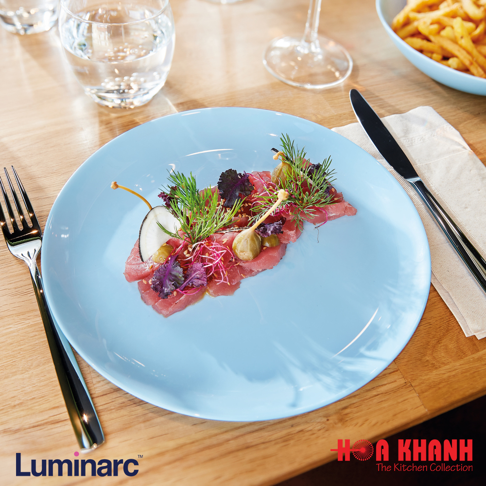 Một điểm nhấn đặc biệt trong bộ sưu tập chén dĩa bàn ăn của L, chính là dòng sản phẩm chén dĩa thủy tinh có màu - Diwali Light Blue. Vẫn xuất phát từ thủy tinh gốm Opal, màu sắc đã được các nhà sản xuất pha trộn một cách khéo léo từ những giọt màu organic, thân thiện với sức khỏe người tiêu dùng. Mang lại tính thẩm mĩ cao khi phối hợp tone màu xanh sáng hiện đại, thanh lịch và tinh tế - phong cách nổi bật đến từ Pháp. Ngoài ra, cảm giác dễ chịu từ màu xanh sáng mang lại cho không gian bàn ăn sự thoải mái nhưng không kém phần nổi bật.