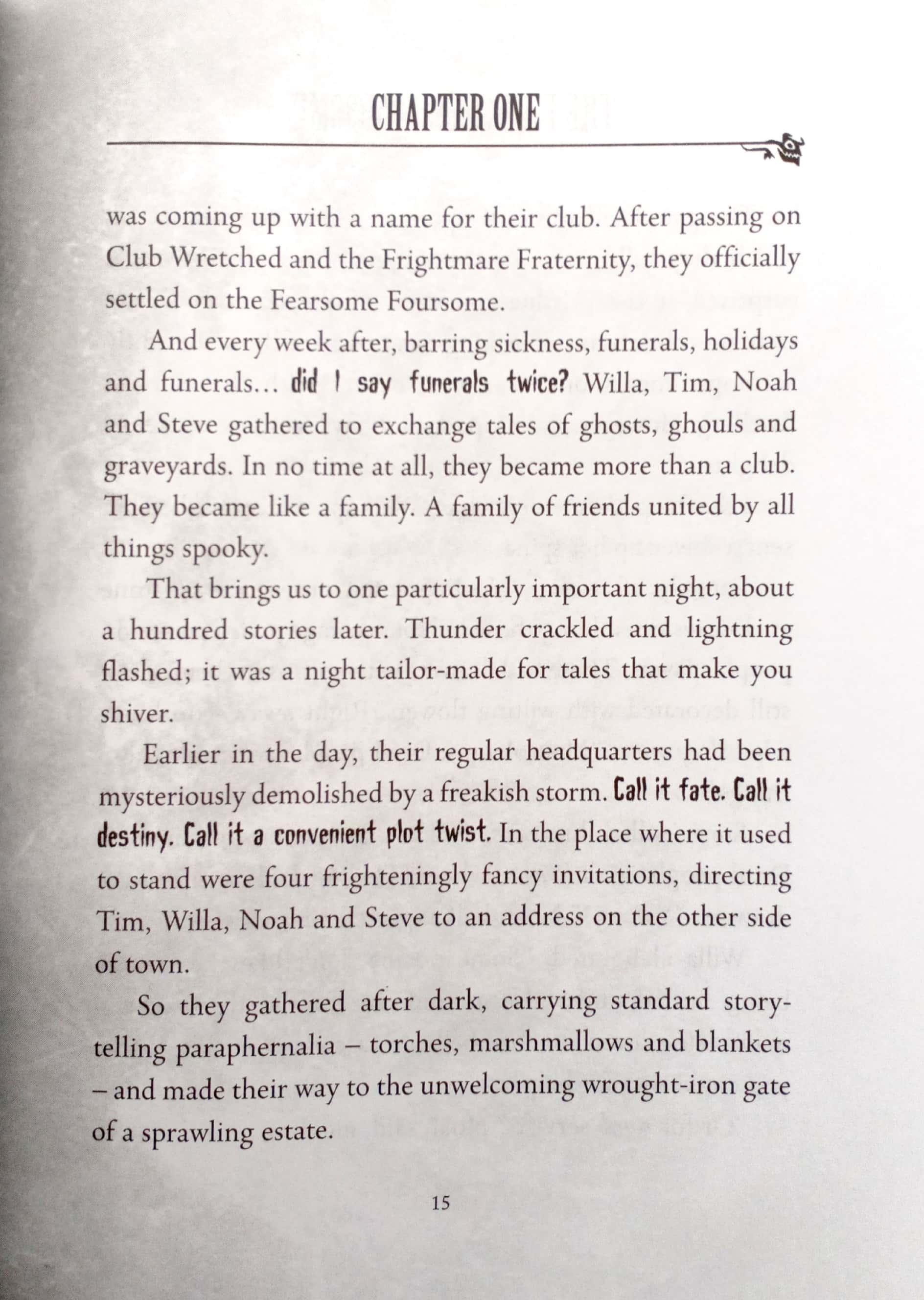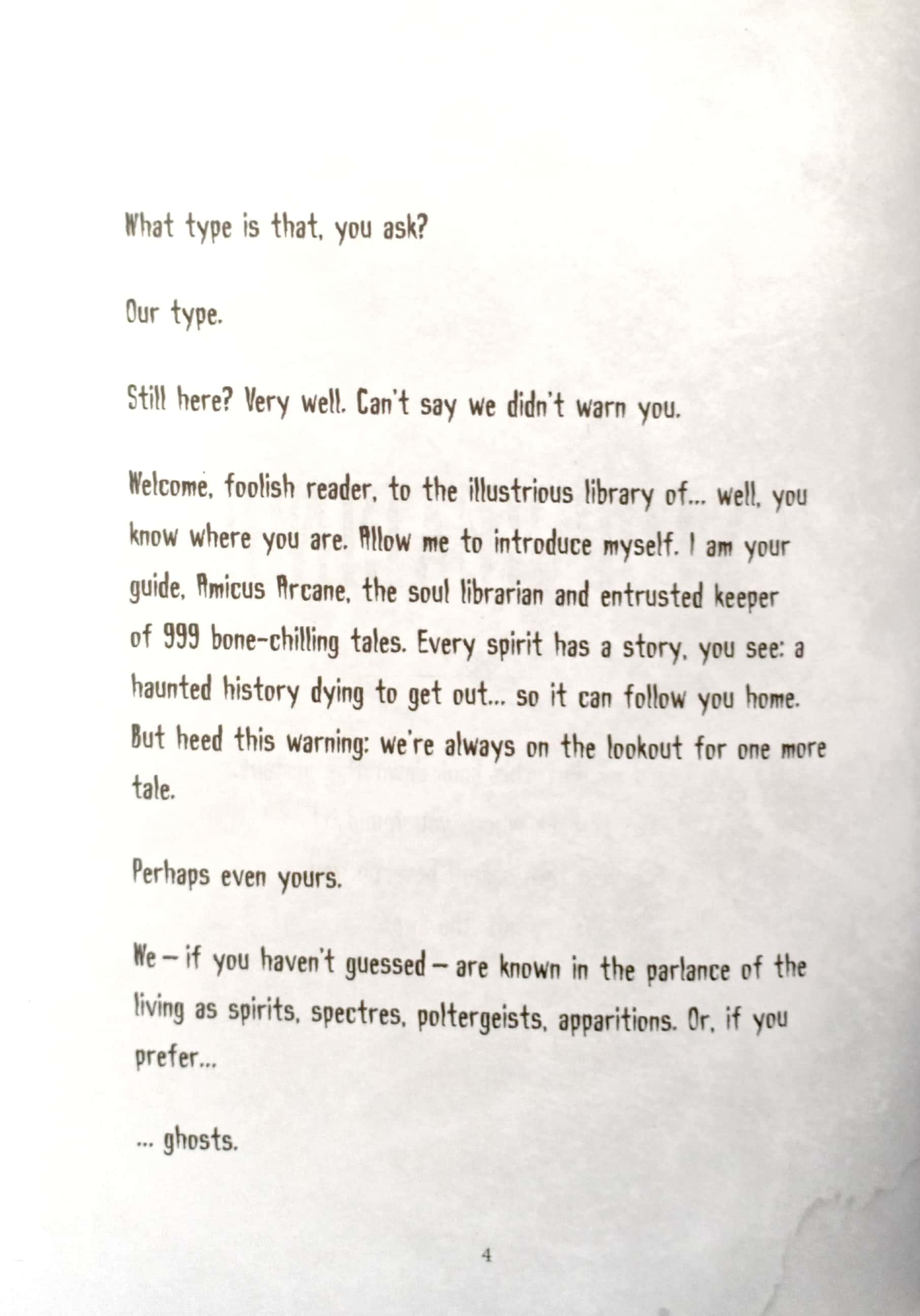 Welcome, foolish mortals, to the lonesome library of the Haunted Mansion. In this bone-chilling book, you will read the terrifying tales of the Fearsome Foursome - four kids who try to out-scare each other with frightening fictions of their own. But just wait until they hear my spooky stories. Who am I? I am Amicus Arcane, your librarian and host. Your Ghost Host. So read if you dare!