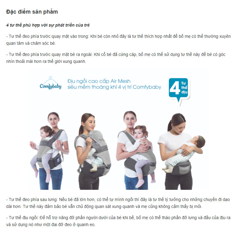 Bố mẹ luôn muốn bên cạnh con trong quá trình khôn lớn, muốn giành cho con những trải nghiệm thú vị. Để mẹ có thể rảnh tay chăm sóc bé ngay cả trong những chuyến đi dạo ngắn, sản phẩm địu đã ra đời như một trợ thủ đắc lực. Thuộc phân khúc cao cấp, sản phẩm Địu 4 tư thế Comfybaby hiện đang được nhiều bố mẹ ưa chuộng.