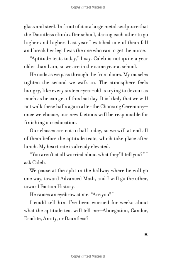 During the highly competitive initiation that follows, Beatrice renames herself Tris and struggles alongside her fellow initiates to live out the choice they have made. Together they must undergo extreme physical tests of endurance and intense psychological simulations, some with devastating consequences. As initiation transforms them all, Tris must determine who her friends really are—and where, exactly, a romance with a sometimes fascinating, sometimes exasperating boy fits into the life she's chosen. But Tris also has a secret, one she's kept hidden from everyone because she's been warned it can mean death. And as she discovers unrest and growing conflict that threaten to unravel her seemingly perfect society, she also learns that her secret might help her save those she loves . . . or it might destroy her.