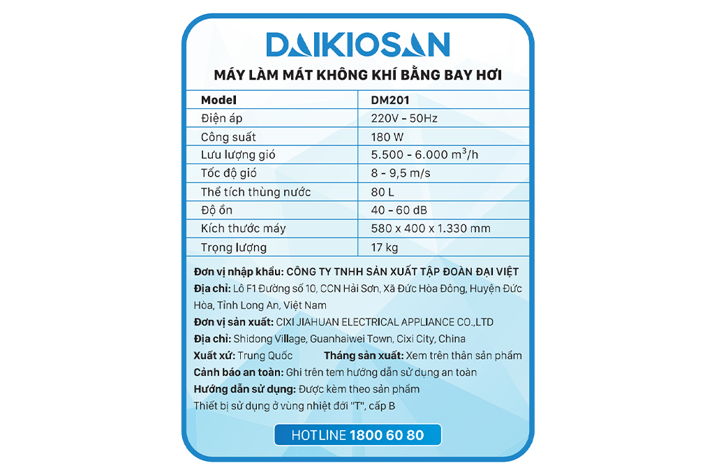 Hướng dẫn sử dụng Quạt điều hoà Daikiosan DM201 công suất 180W, 80 lít cho phòng 50-60mv