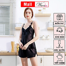 Đồ bộ mặc nhà phi lụa cao cấp WANNABE BSS39 bộ sọt theo phong cách trẻ trung năng động nhưng cũng không kém phần nữ tính quyến rũ với thiết kế áo hai dây cổ tim phối ren gợn sóng đối xứng cách điệu từ cổ áo lên dây áo trông lạ mắt trẻ trung