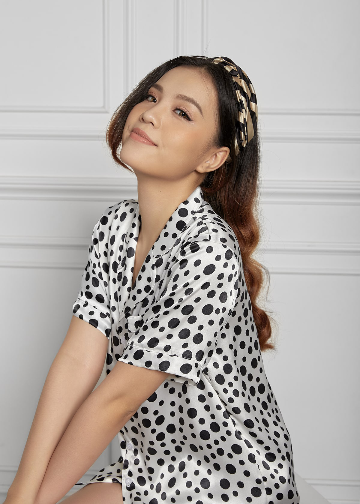 BỘ PYJAMA SATIN LỤA HÀN QUỐC MÀU TRẮNG HỌA TIẾT CHẤM BI - LA MỘC chất liệu vải SATIN LỤA