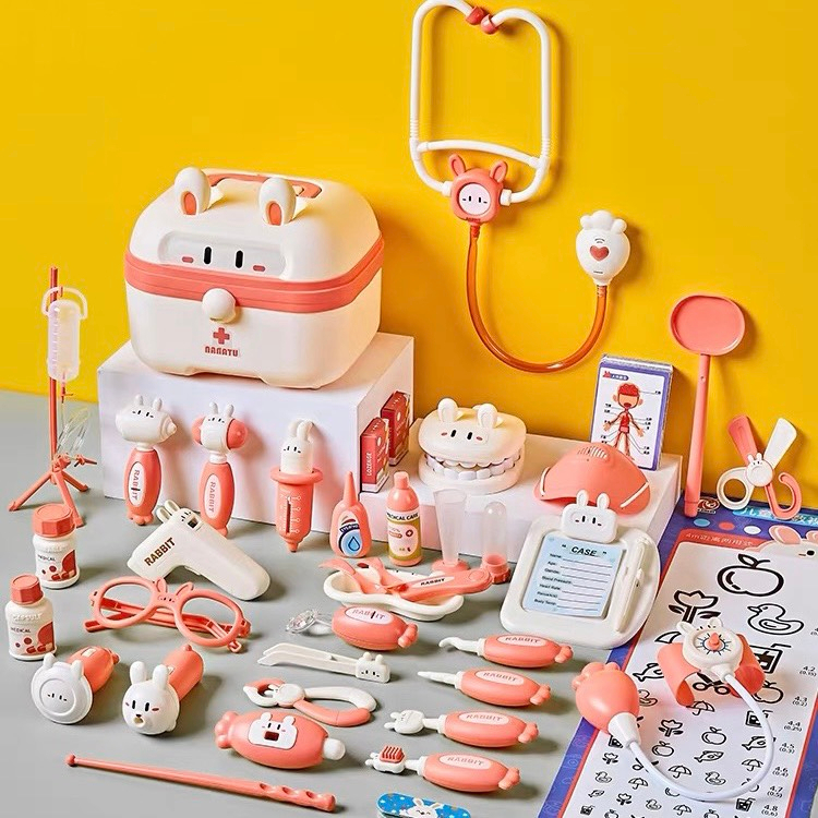 - Bộ đồ chơi bác sĩ cho bé 36 chi tiết gồm đầy đủ các dụng cụ chữa bệnh như hộp đựng dụng cụ, ống nghe nhịp tim, bảng ghi chú,….(không có bảng chụp x-quang) được thiết kế đáng yêu, dễ thương với tông màu chủ đạo là màu hồng và xanh tươi sáng, tất cả để trong một chiếc hộp tai Thỏ xinh xắn, giúp trẻ thỏa sức vui chơi mà vẫn đảm bảo cất gọn nhiều đồ sau khi chơi xong.