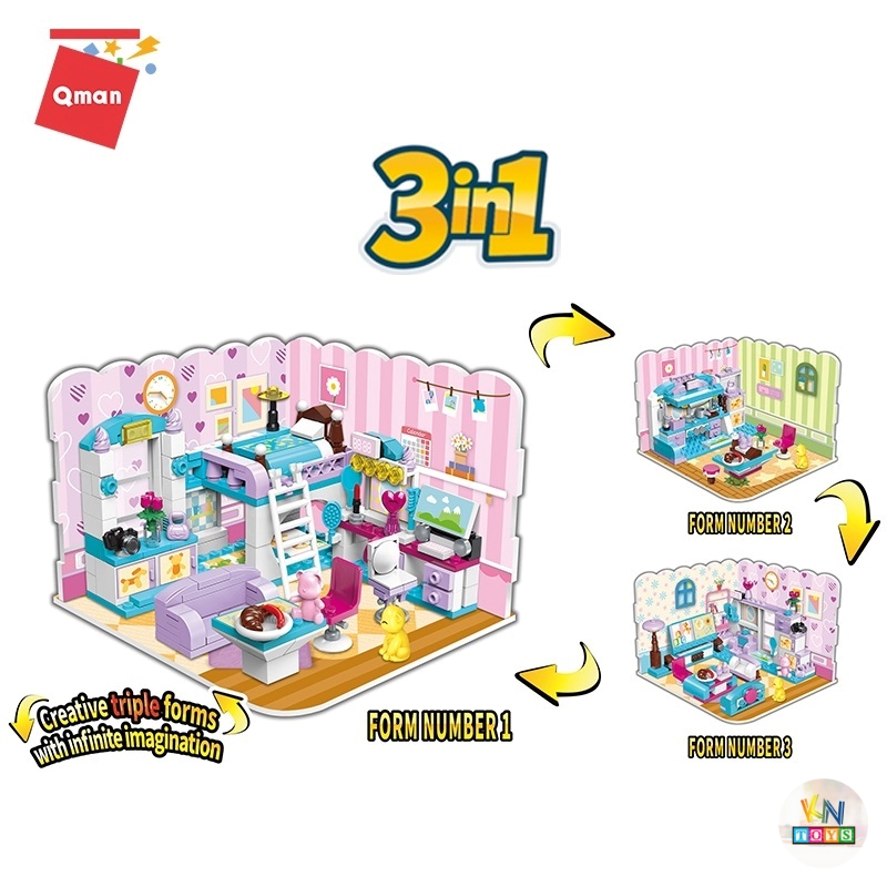 Đồ chơi lắp ghép,xếp hình Qman 4801: Phòng của bé gái Căn phòng bé gái biến đổi 3 trong 1 mô phỏng một căn phòng của bé gái với nhiều chi tiết đáng yêu và màu sắc tươi sáng, thu hút sự chú ý và kích thích trí tưởng tượng của trẻ. Thông tin sản phẩm: