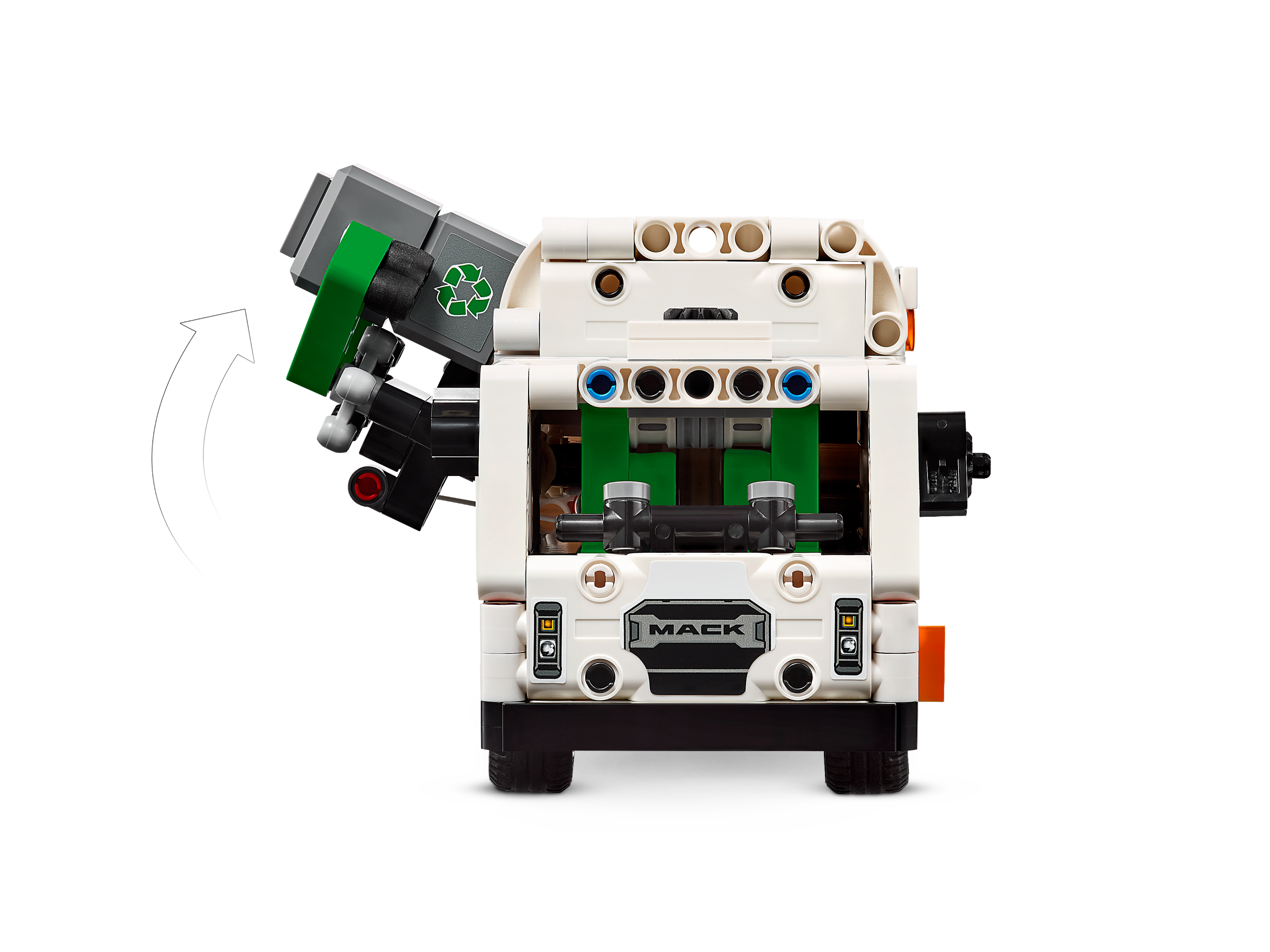 Giúp giữ cho thành phố sạch sẽ với Đồ chơi lắp ráp Xe tải rác điện Mack LR LEGO Technic. Chiếc xe Mack trong thế giới thực chạy bằng điện, khiến việc thu gom rác trở nên xanh hơn. Bạn đã sẵn sàng thử nghiệm phiên bản mô hình này chưa? Mở cửa để vào cabin của người điều khiển sau đó điều khiển xe tải vào vị trí. Sử dụng bộ tải bên hông để lấy, nâng và lật thùng rác trước khi chuyển sang điểm dừng tiếp theo.
