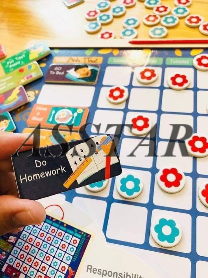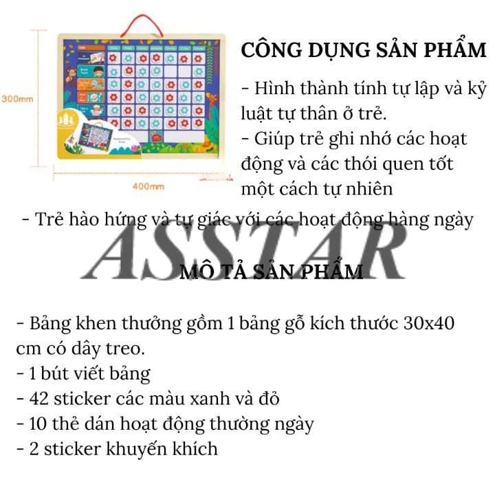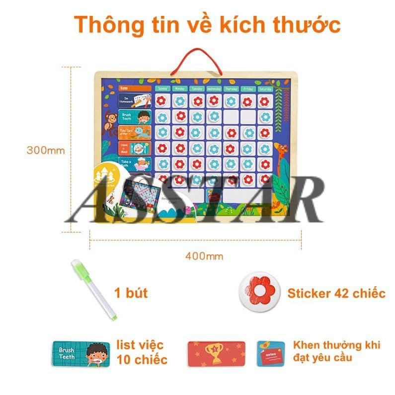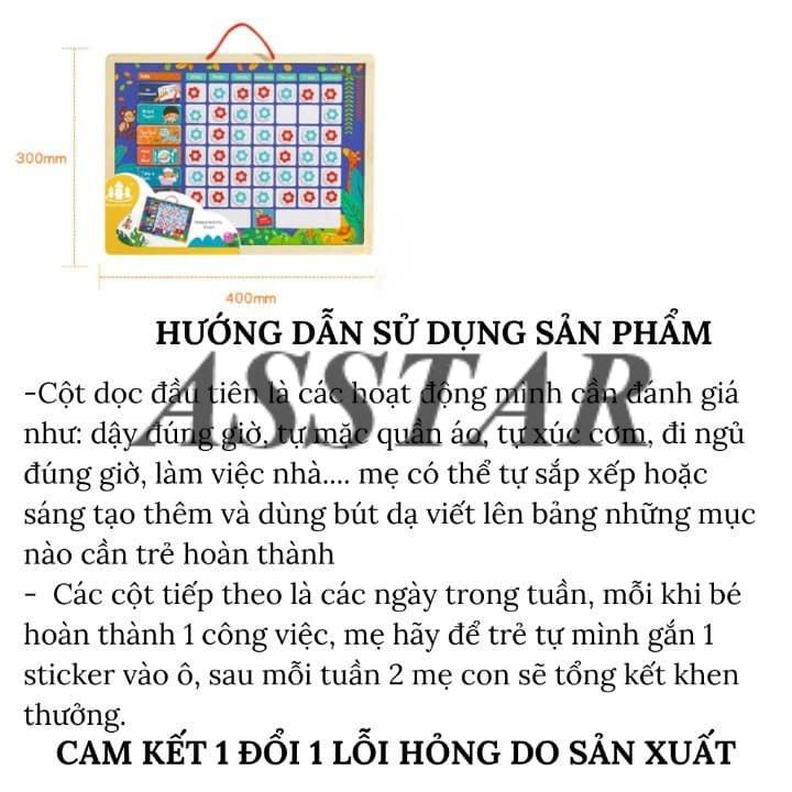 - 1 bộ gồm: 1 bảng có dây treo, 1 bút viết bảng, sticker và thẻ dán hoạt động thường ngày. CÁCH SỬ DỤNG: ️ Cột dọc đầu tiên là các hoạt động mình cần đánh giá như: dậy đúng giờ, tự mặc quần áo, tự xúc cơm, đi ngủ đúng giờ, làm việc nhà mẹ có thể sáng tạo thêm và dùng bút dạ viết lên bảng! ️ Các cột tiếp theo là các ngày trong tuần, mỗi khi bé hoàn thành 1 công việc, mẹ hãy để bé tự mình gắn 1 sticker vào ô, sau mỗi tuần 2 mẹ con sẽ tổng kết khen thưởng. Chỉ cần thưởng vài tuần là bé sẽ vào nếp mẹ mong muốn! Trước khi bắt đầu, 2 mẹ con hãy cùng thảo luận với nhau về những việc con cần thực hiện và tất nhiên là cả phần thưởng cho nỗ lực của con. LỢI ÍCH:
