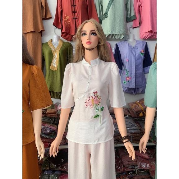 Đồ lam đi chùa cho nữ - Set mẫu xẩm quạt thêu Hoa chất liệu lụa trượt cao cấp phong cách lịch sự