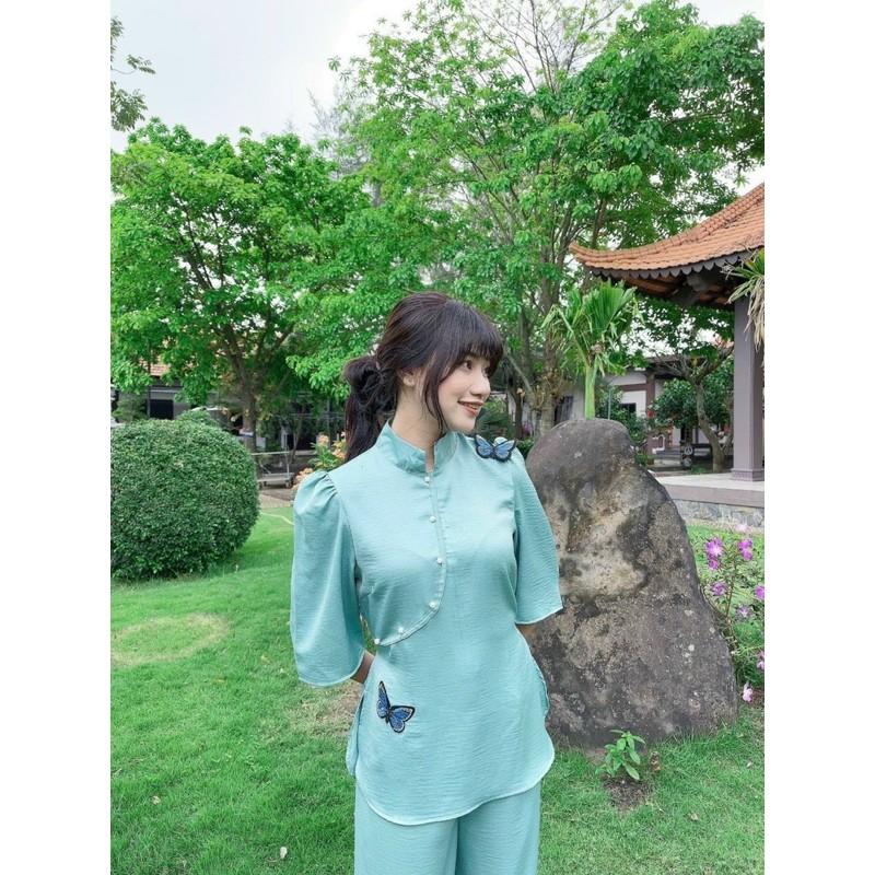 Quần áo phật tử, đồ lam đi chùa mẫu lụa đính bướm A53, shop Hồng Phúc An