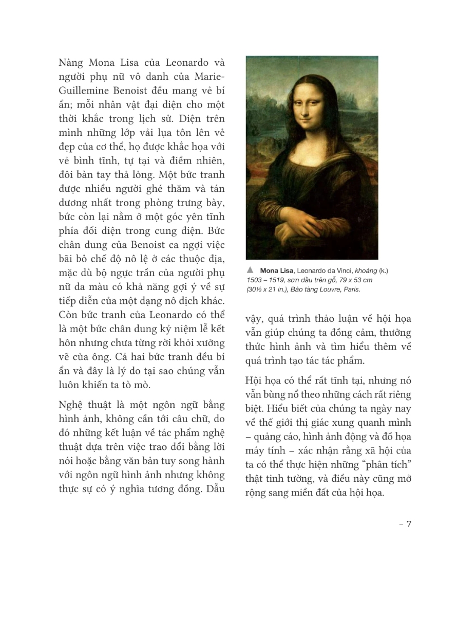 Hình minh họa trong cuốn sách bao gồm hai loại: Thứ nhất là phiên bản đầy đủ của các bức tranh, đặc biệt là 50 bức tranh được lựa chọn để phân tích kỹ lưỡng ở phần hai của cuốn sách. Thứ hai là các chi tiết nhỏ, các phần đáng chú ý trong một bức tranh được cắt ra và phóng to, nhằm minh họa cho điều mà tác giả đang tập trung phân tích, giúp độc giả dễ dàng theo dõi.