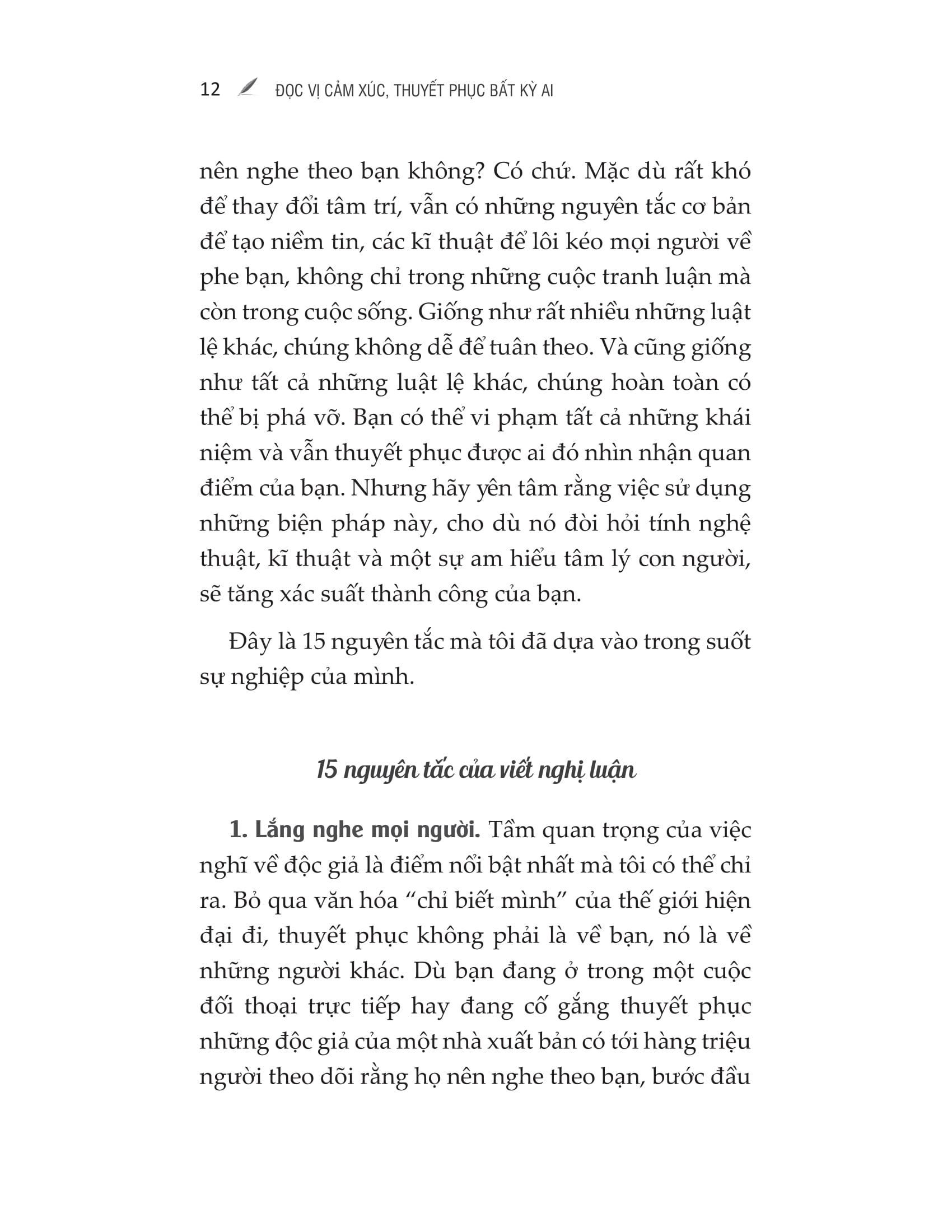 Là người phụ trách mục Góc nhìn cho tờ New York Times, tác giả Trish Hall đã dành nhiều năm đắm chìm trong những cuộc tranh luận và những bài viết thể hiện quan điểm. Trong quá trình đó, cô thường xuyên phải tiếp xúc với những câu văn rối rắm, những biệt ngữ khó hiểu và những bài viết chán ngắt. Dựa trên kinh nghiệm m.ình, Trish Hall đã viết “Đọc vị cảm xúc, thuyết phục bất kỳ ai” để giúp người đọc giao tiếp một cách hiệu quả và thu phục lòng người. Thông qua cuốn sách này, Trish Hall sẽ chỉ cho độc giả cách trình bày ý kiến của m.ình thật thuyết phục, cho dù bạn đang viết một bài luận cho giáo sư tại trường đại học, một ứng tuyển việc làm, hay cần thuyết trình về kế hoạch của m.ình tại nơi làm việc. Mặc dù cuốn sách chủ yếu là về viết lách, tác giả đã chèn thêm các yếu tố tâm lý học để làm luận chứng cho những phương pháp mà cô đưa ra. Hiểu biết về hành vi của con người sẽ rất hữu dụng khi giao tiếp trực tiếp. Vậy thì, bạn có thể hỏi, có luật lệ nào cho việc tranh luận, tạo niềm tin và thuyết phục người khác nên nghe theo bạn không? Có chứ. Mặc dù rất khó để thay đổi tâm trí, vẫn có những nguyên tắc cơ bản để tạo niềm tin, các kĩ thuật để lôi kéo mọi người về phe bạn, không chỉ trong những cuộc tranh luận mà còn trong cuộc sống. Giống như rất nhiều những luật lệ khác, chúng không dễ để tuân theo. Và cũng giống như tất cả những luật lệ khác, chúng hoàn toàn có thể bị phá vỡ. Bạn có thể vi phạm tất cả những khái niệm và vẫn thuyết phục được ai đó nhìn nhận quan điểm của bạn. Nhưng hãy yên tâm rằng việc sử dụng những biện pháp này, cho dù nó đòi hỏi tính nghệ thuật, kĩ thuật và một sự am hiểu tâm lý con người, sẽ tăng xác suất thành công của bạn.
