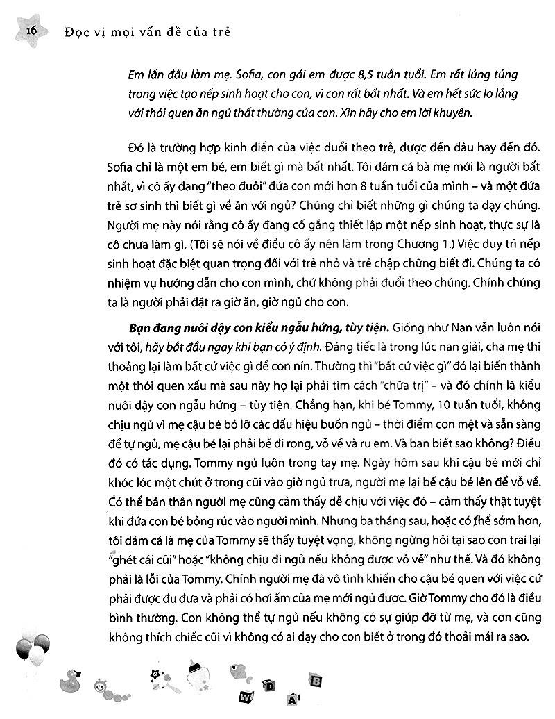 Trong những chuyến đi, trên trang web và thư điện tử, tôi đã nhận được rất nhiều lá thư cảm ơn và khẳng định từ những ông bố, bà mẹ đã làm theo lời khuyên của tôi. Nhưng tôi cũng bị ngập trong những yêu cầu nhờ giúp đỡ từ những người mua cuốn sách đầu tiên của tôi quá trễ. Có lẽ bạn đang cố gắng ép con bạn vào một nếp sinh hoạt đã được sắp sẵn, tôi đoán vậy, nhưng bạn không chắc là có thể áp dụng cùng một nguyên tắc cho trẻ 8 tháng tuổi và trẻ mới sinh hay không. Có thể bạn bối rối vì không hiểu tại sao con bạn lại không làm những việc mà các em bé khác vẫn làm. Hoặc có thể bạn đang phải đối mặt với vấn đề khó ngủ, khó ăn hay vấn đề về hành vi – hoặc tệ hơn nữa là tất cả các vấn đề trên. Dù vấn đề đó là gì thì điệp khúc đau khổ của bạn vẫn luôn là: “Tracy, tôi phải bắt đầu từ đâu – tôi phải làm gì trước?” Bạn cũng có thể thắc mắc tại sao một số chiến lược tôi gợi ý cho bạn lại có vẻ không có tác dụng với con của bạn.